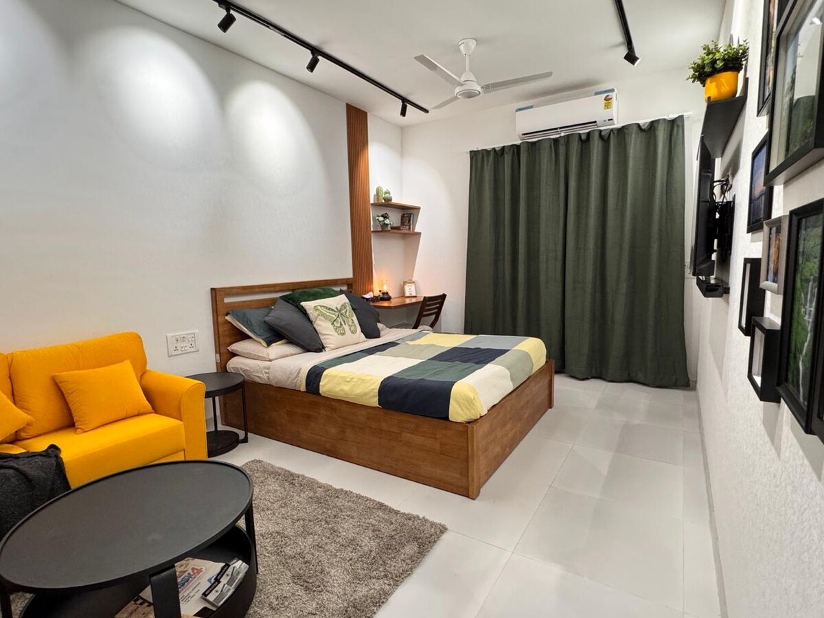 Luxurious Yellow Block Studio at the foothills of Ulhas Valley with a pvt. balcony and panorama mountain views from the top floor. Friðsælt frí til að slappa af. Fullbúið með þráðlausu neti, JBL 2.1 Home Theatre, BT Music System, Full-HD LED sjónvarpi. Stílhreint baðherbergi með snyrtivörum. Pantry with tea/coffee supplies, RO water, Microwave, Induction Hob, Fridge & s/w Toaster and a comfortable study space. Algeng þægindi á staðnum eins og sundlaug, leikjaherbergi, líkamsrækt, smáleikhús, hjólreiðar og veitingastaður.
