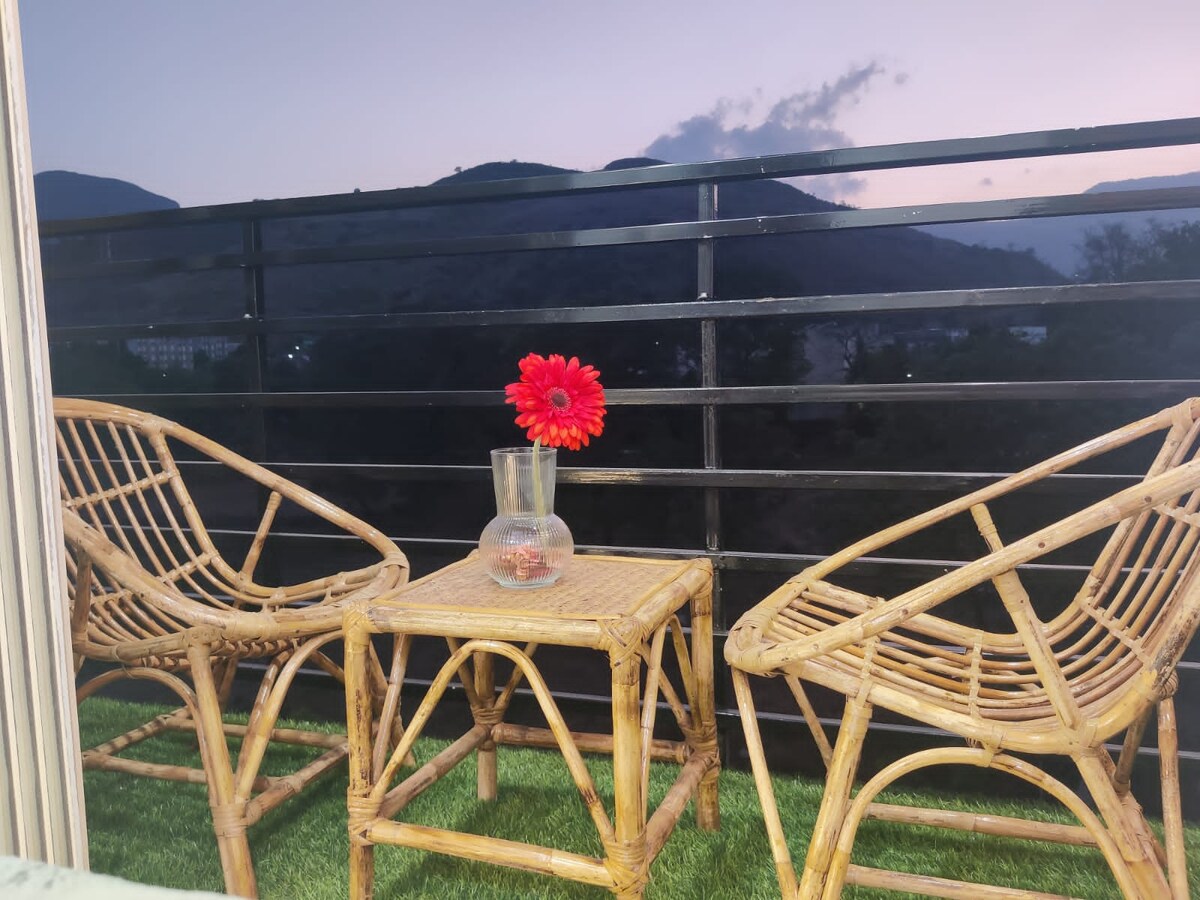 🌴 Verið velkomin í Tropical Bliss, litlu paradísina þína nálægt Karjat. 🌿 Þessi glæsilega stúdíóíbúð er staðsett innan um gróskumikinn gróður og innrammaða af tignarlegum fjöllum og er hönnuð með hitabeltislegum innréttingum sem henta vel pörum, ferðamönnum sem eru einir á ferð eða litlum fjölskyldum sem vilja komast í friðsælt frí.