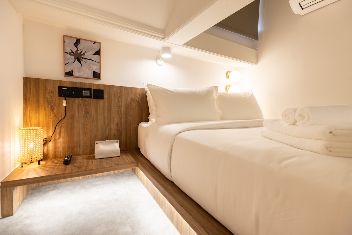 Studio Queen (No Window) íbúðin okkar býður gestum upp á notalegt rými fyrir þá sem eru að leita sér að einstakri gistingu til að kynnast hverfinu. Engir gluggar eru í þessari eign en herbergið er vel upplýst. Fullbúin húsgögnum með nauðsynlegum þægindum fyrir dvöl þína. Matar- og matvöruverslanir eru einnig steinsnar í burtu Stærð herbergis: 122 fermetrar