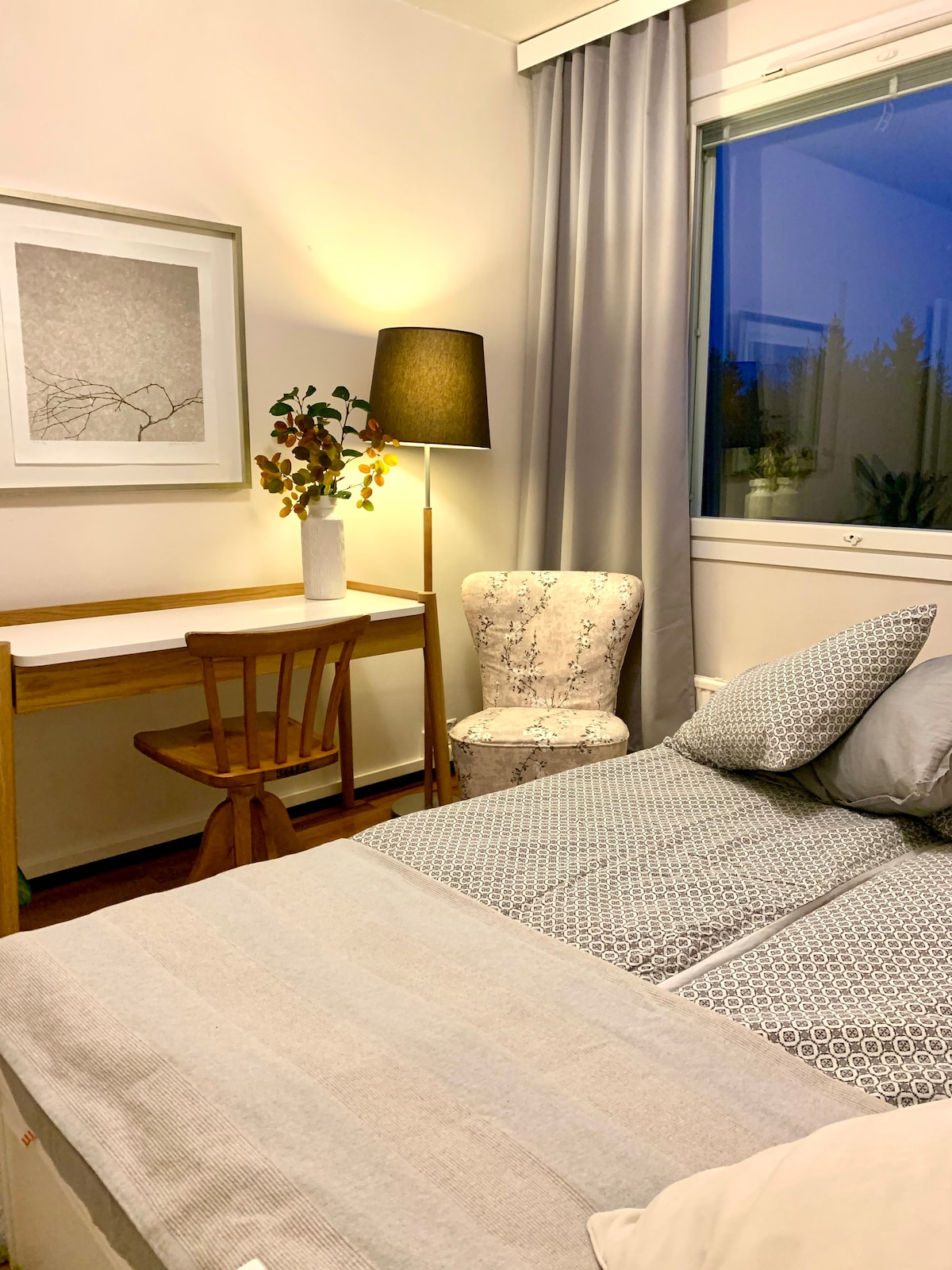 This small and compact apartment is located near good services, beautiful trecking paths and lakes with great swimming. Even in the winter you will have a chance to try cold dipping in a lake with a sauna. You will reach Tampere city in 20 minutes by tram. There is no kitchen but the apartment is equipped for making coffee/tea, preparing breakfast and heating up food. A peaceful location on 7th floor. Well suited for remote working and studying.