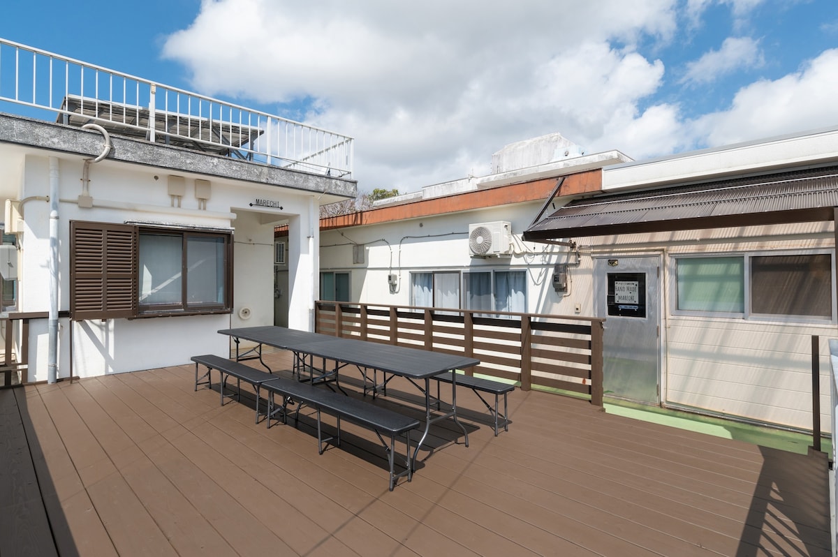 Cozy Kumejima Inn – Perfect for Families & Groups Stay in quiet Kumejima, Okinawa. The inn fits up to 10 guests with 7 single beds and 3 futons. Relax in the living room, watch movies on the 100-inch projector, or BBQ on the outdoor deck. The kitchen is fully equipped, with comics and picture books. A work desk, washing machine, and dryer are included. Nearby, enjoy seafood at izakayas or try Okinawan dishes. Staff are on-site, and free parking is available.
