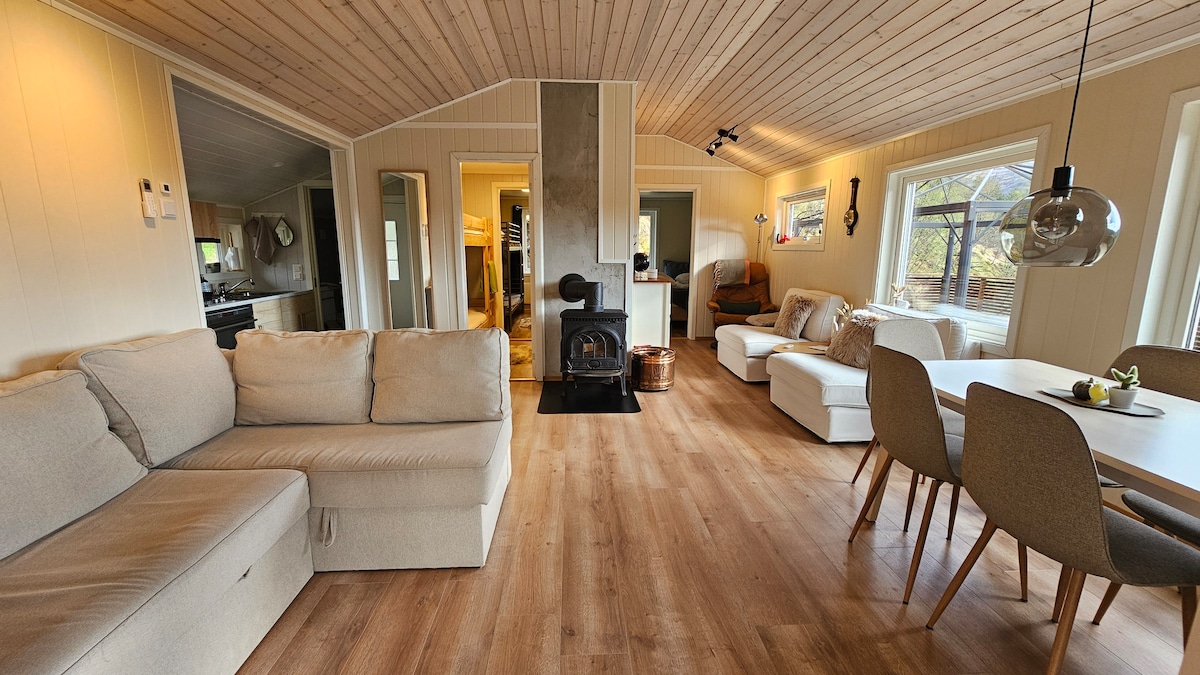 Vertu með🫶 nóg af orku fyrir þennan einstaka og kyrrláta gististað. Njóttu kyrrðarinnar í lúxusnum niður í síðasta smáatriðið þar sem hann iðar af gæðum og allt er tilbúið til að fylla á orkuna! Komdu með fjölskylduna og njóttu samverunnar. Hér er allt annað hvort í kofa eða rétt fyrir utan dyrnar. Þar sem er eitthvað fyrir alla! Njóttu gufubaðs og heits potts í nuddpottinum eftir langan dag í fjöllunum eða dagsferð til Folgefonna jökuls. Einnig er pláss fyrir góðar samræður við stóra borðstofuborðið.