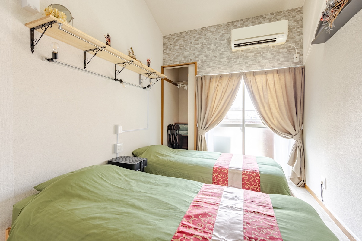 2Rooms&ロフト付きのお部屋で1階にあります。 専用の玄関で、トイレ、バスルーム、キッチン、部屋は全て貸切で専用です。 シングルベッドが2台、ロフトにダブルのマットレスが2つあります。 お部屋を広く使用したい時は、シングルベッドを重ねることが出来ます。 ◼️設備 TV、Wi-Fi、エアコン2台、冷蔵庫、電子レンジ、電気ポット、鍋、各種お皿(調味料はございません)洗濯機、洗濯洗剤、扇風機 ◼️アメニティー タオル、バスタオル、シャンプー、コンディショナー、ボディーソープ、ヘアードライヤー、歯ブラシ、歯磨き粉、スリッパ ◼️注意事項 ロフトの天井は低く、ハシゴの昇り降りが急ですので、高齢の方や小さなお子様には不向きです。 最大5人までご利用可能ですが、荷物を広げるスペースが狭いのでご了承下さい。 ◼️近くのコンビニ、スーパー コンビニ(セブンイレブン、ローソン、ファミリーマート)徒歩2分 ディスカウントストアMrMaxまで徒歩3分 スーパーマーケット(サニー、マックスバリュー)まで徒歩3分 同じ建物にも部屋がありますので、人数が多い場合はご連絡下さい。