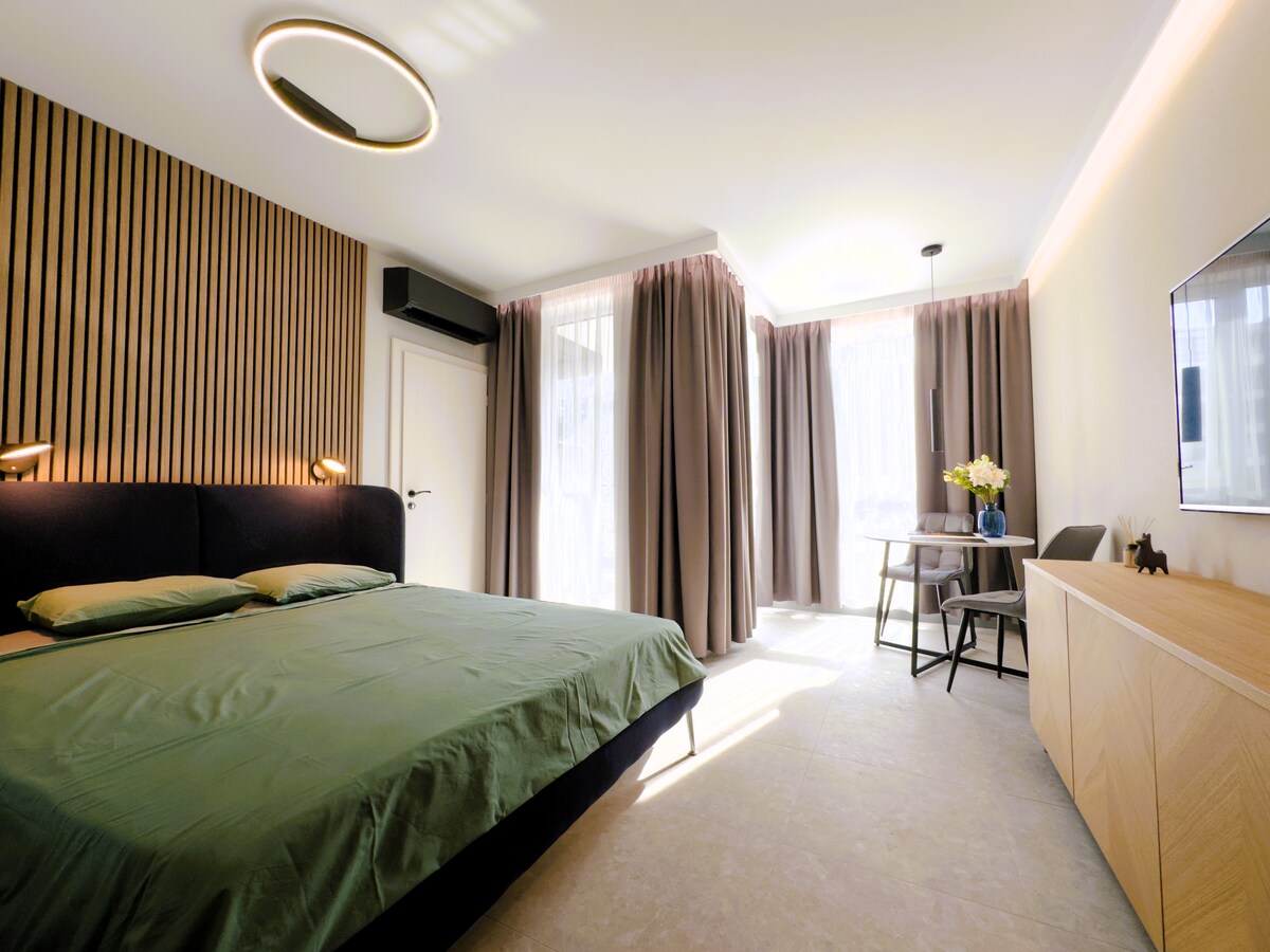 Verið velkomin í glænýju íbúðina okkar sem er hönnuð á skemmtilegan hátt og staðsett við hliðina á stærsta viðskiptamiðstöð Búlgaríu. Þetta rými er friðsælt og litríkt og býður upp á alla þá þægindi sem þú þarft fyrir vinnu- eða frístundarferð til Sófíu. Þú munt njóta þín allt árið í þessari nýuppgerðu byggingu þar sem tveir loftræstibúnaðir eru til staðar fyrir heita sumardaga og miðstýrð hitun fyrir notalega vetrara. Þú getur auðveldlega innritað þig með lyklunum hjá dyrakonunni eða þú getur innritað þig með lyklunum úr lyklaboxinu.