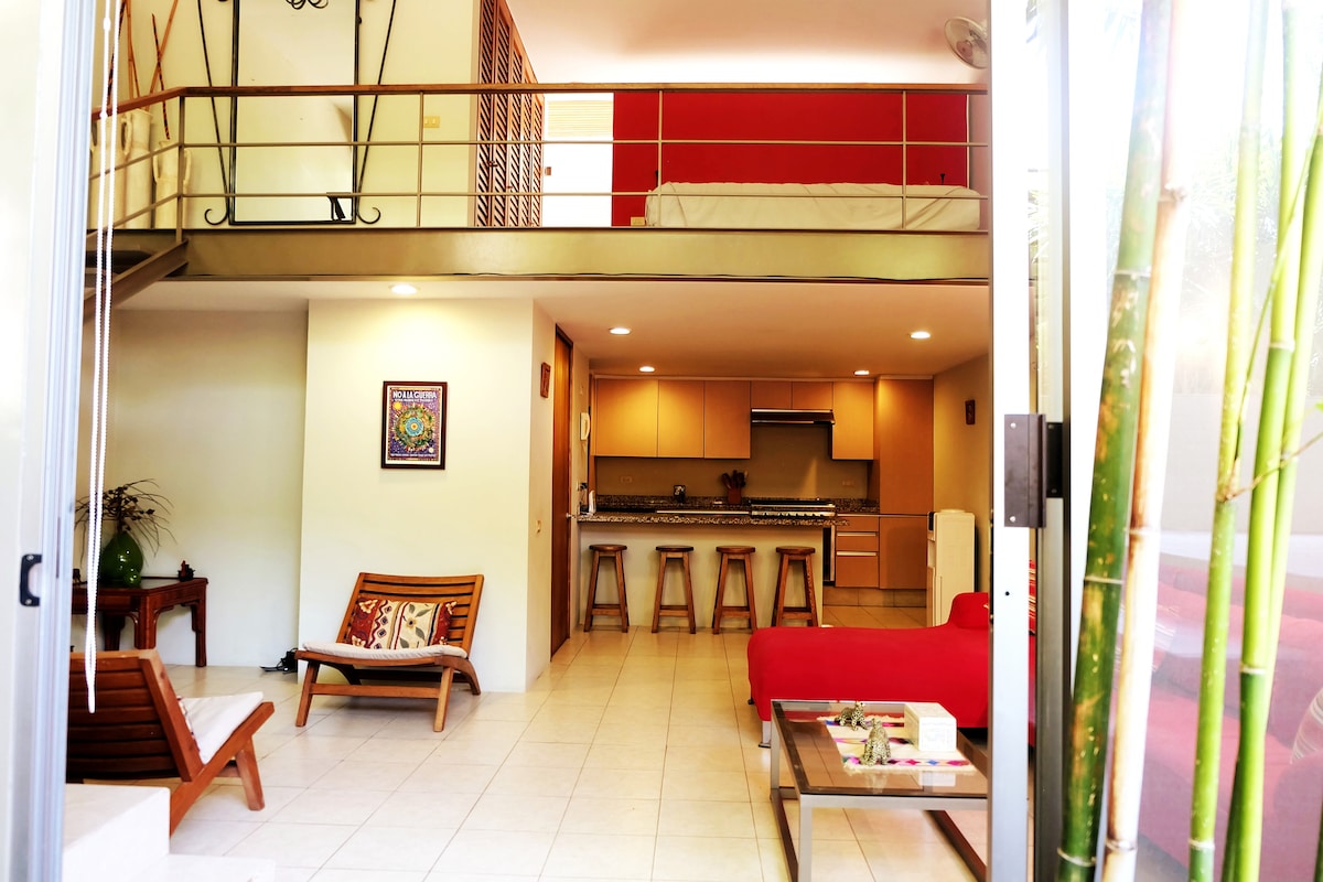 Nútímalegt og fágað, sjálfstætt, á efri hæðinni, fullkomið næði, nútímalegt, nýbyggt og búið hágæðaefni og húsgögnum. Stofa, morgunverðarbar, hjónarúm og svefnsófi, fullbúinn eldhúskrókur, fullbúið baðherbergi, A/C, internet, 45"skjár. HEITT VATN. Aðalgarður, Matvöruverslun, minisupers, apótek og veitingastaðir í nágrenninu. Tilvalið fyrir 2 gesti. Staðsett í friðsælli undirdeild El Paraíso Reencontrado.