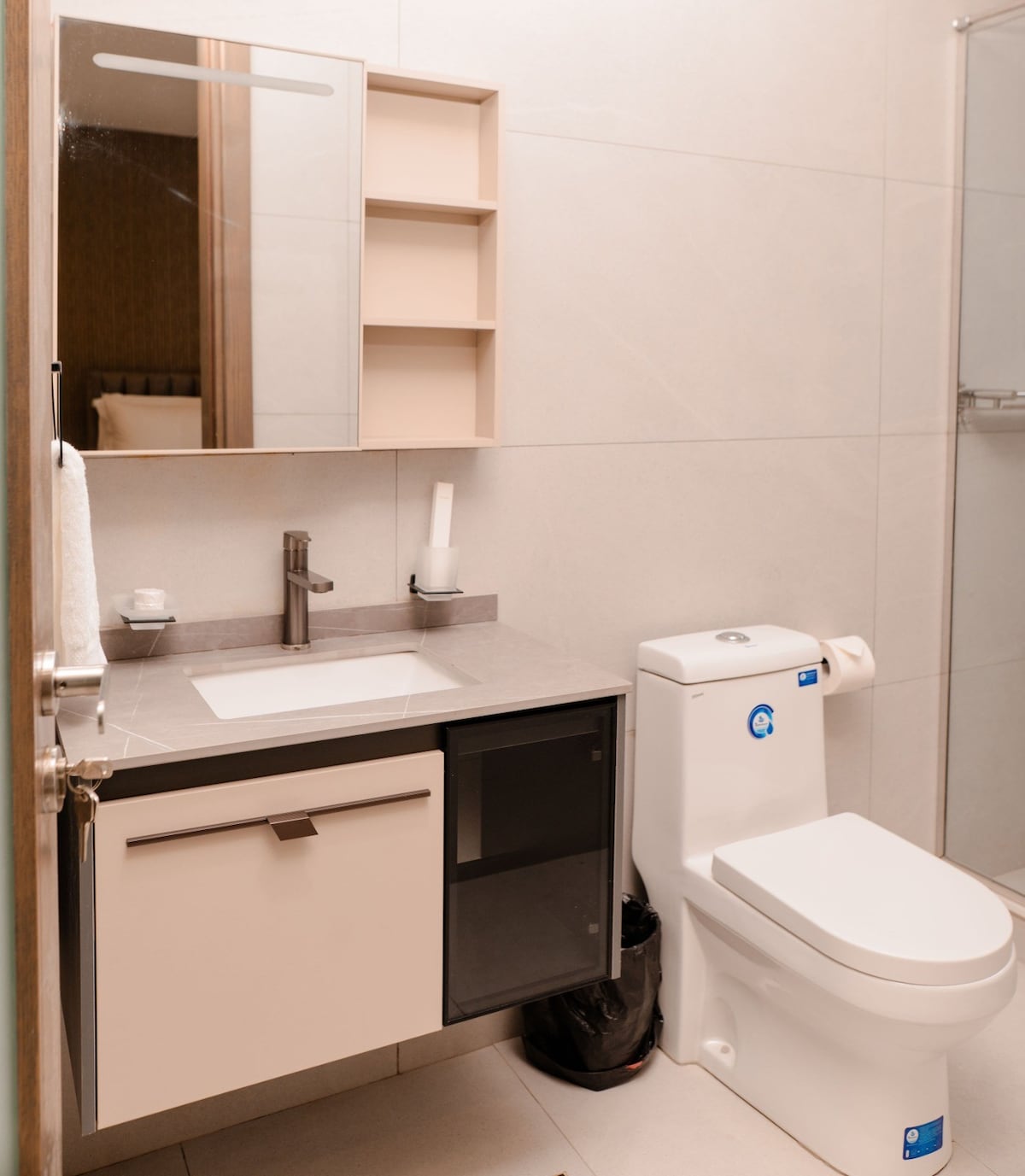 Verið velkomin í þessa fallegu 1 herbergja en-suite íbúð á Park Apartments (D05), ásamt svölum fyrir fallegt útsýni. Stofan er óaðfinnanlega með opnu eldhúsi og borðstofu og stuðlar að rúmgóðu andrúmslofti með nútímalegum og hefðbundnum stíl. Viðbótarþvottaherbergi fyrir gesti bætir við þægindum. Tilvalið fyrir nútímalegt líf.