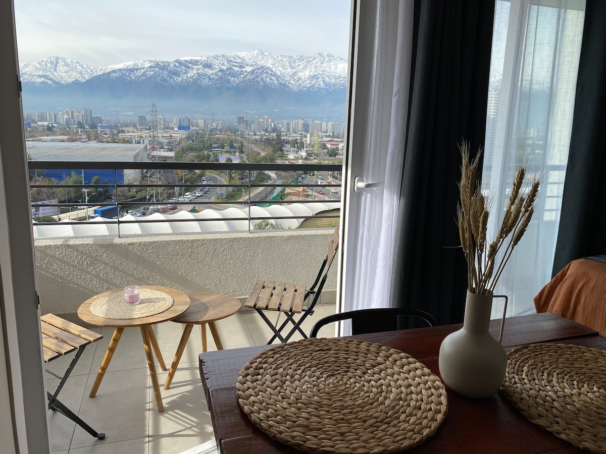 Nútímalegt depto. með fallegu útsýni yfir fjallið Staðsett í miðlægum og hljóðlátum geira, 500 metrum frá Bellavista-neðanjarðarlestinni, 700 metrum frá Mall Plaza Vespucio, 800 metrum frá Clínica Dávila, í 20 mínútna fjarlægð frá flugvellinum, í 10 mínútna fjarlægð frá Bicentenario-leikvanginum og í 7 mínútna fjarlægð frá risastóra leikvanginum. 1 svefnherbergi + svefnsófi í stofu Uppbúið eldhús Einkabaðherbergi Svalir með útsýni yfir fjallgarðinn Þráðlaust net og sjónvarp með öppum Fullbúið Nútímalegt, þægilegt og minimalískt Sundlaug, líkamsrækt, quincho, samvinna og viðburðarherbergi