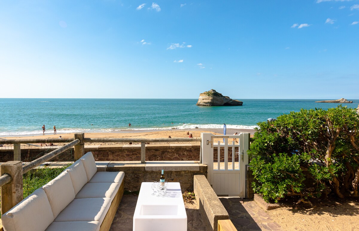 Verið velkomin í Biarritz-stúdíóið mitt við sjóinn með ótrúlegu útsýni yfir aðalströndina . Njóttu þess að vera á ströndinni og fara á brimbretti án bíls ! Ströndin er við botom húsnæðisins... Svalirnar með húsgögnum gera þér kleift að borða um leið og þú dáist að öldum og sólsetri! Í húsnæðinu er meira að segja sundlaug (júní/september) ... Þetta er líklega eitt af ákjósanlegustu svæðunum fyrir ferðamenn: Strönd, brimbretti, sundlaug, veitingastaðir, verslanir ...