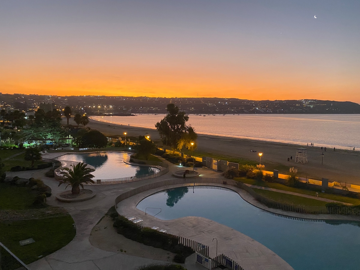 Frente al mar, primera línea de la playa, al lado del casino Enjoy. Vista directa al mar. Edificio con todas las comodidades, piscinas, gimnasio, lavandería, portería 24 horas, estacionamiento cubierto. A pocos pasos de los mejores restaurantes, minimarkets, ciclovía y a 20 minutos del aeropuerto de Coquimbo. Departamento completamente equipado, con 3 habitaciones, para 6 personas. Cuenta con tv por cable, internet, cocina equipada, jacuzzi en alcoba principal, ropa de cama y toallas.