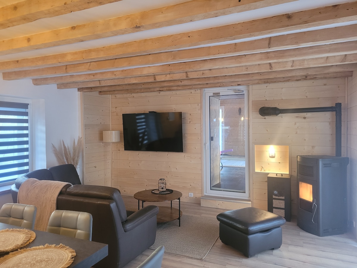 Eco-responsible chalet in wood frame of 2024 located at a height of 1035 m in the BAYARD district. 120m2 flatarmál með aðgengi að 20m2 leikjaherbergi. Rúmgóð og fullbúin stofa/stofa/eldhús 3 tvíbreið svefnherbergi: 2 með 180x200 rúmum og 1 með tveimur 90x200 rúmum 2 baðherbergi með ítalskri sturtu 1 net í tóminu til að njóta útsýnisins Útiverönd sem er 50 m2 að stærð með nuddpotti og sólbaði í ókeypis aðgangi sem veitir yfirgripsmikið útsýni yfir Forêt du Risoux og Mont d 'Or.