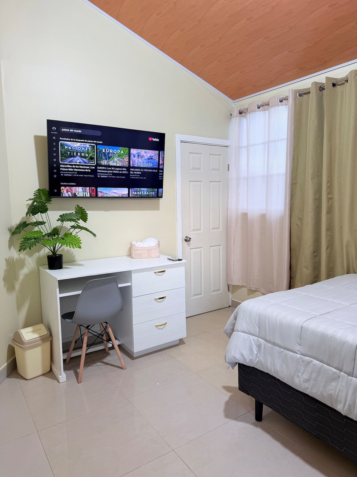 2 herbergi með king-size rúmum (skápur og baðherbergi) Frábær staðsetning (5 mín akstur frá CA-5 og 3 mín frá Central Park) Snjallsjónvarp og aðalherbergi á herbergi A/C í herbergjum og aðalherbergi Fullbúið eldhús með einkaverönd Innri þvottahús (þvottavél og þurrkari) Vinnusvæði með skrifborði Electric Generator Water Well Öryggismyndavélar með heitu vatni Bílskúr Þak fyrir 1 bíl (auka bílastæði fyrir framan) Algerlega einka