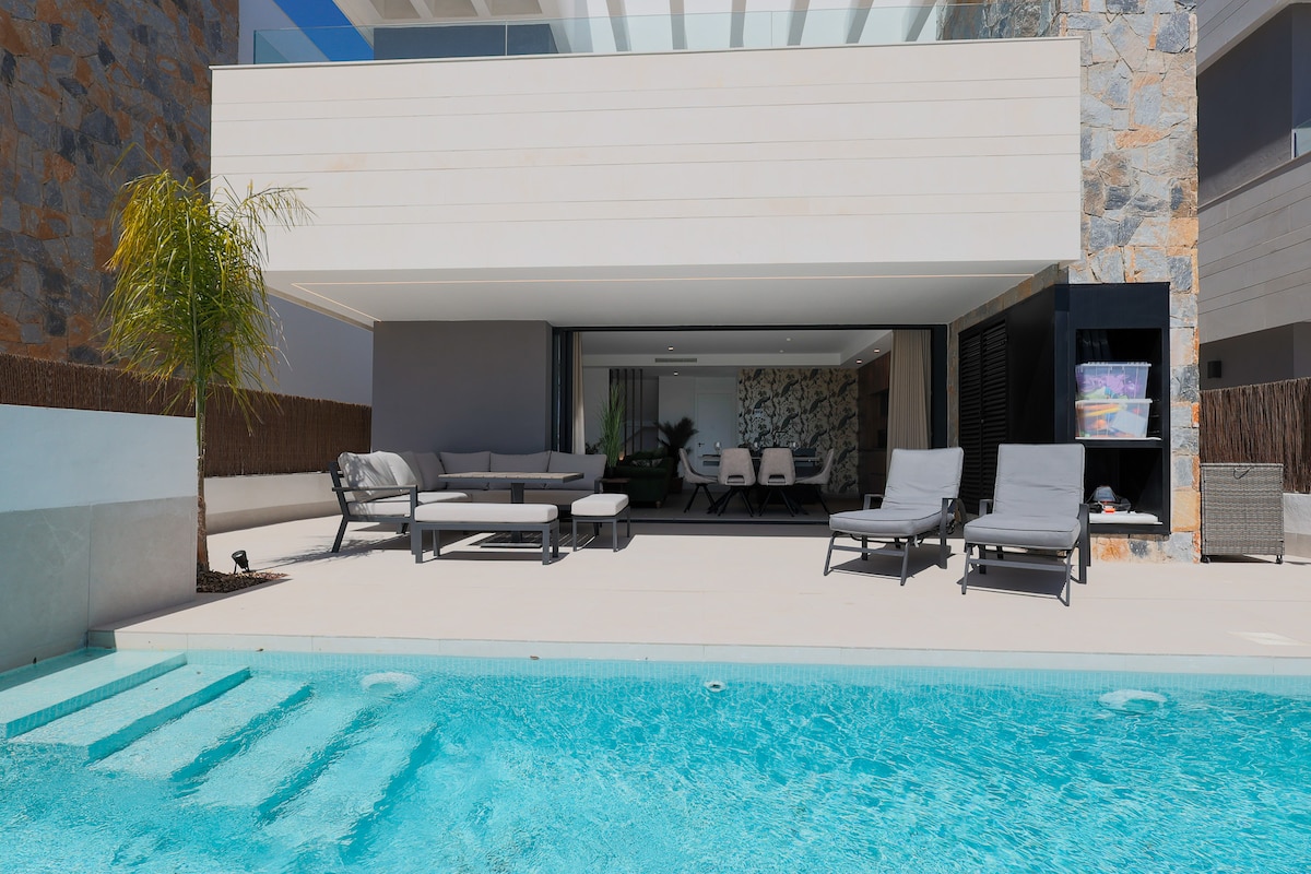 Golf, strönd, barir, veitingastaðir, stórborg eða róleg afslöppun. Taktu með þér fjölskyldu eða vini og njóttu þessarar fáguðu gistingar. Fjölbreytt þægindi eru í glænýju lúxusvillunni. Einkagarður og sundlaugarsvæði með ýmsum setusvæðum, sólbekkjum og grilli sem er fullkomið til að slaka á utandyra. Þú getur freytt á þremur hæðum með stórri þakverönd þar sem þú getur notið útsýnisins yfir borgina og í átt að sjónum. Loftræsting og hratt net. Við bjóðum upp á 3 hjónarúm 160*200 og 4 einbreið rúm 90*200.