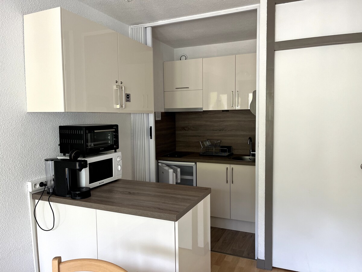 40 m2 íbúð. Rólegt varmahverfi, fjallaútsýni. Opinber röðun 3 stjörnur. Svefnpláss fyrir 2 (21/11/23) Á 1. hæð, lyfta. Tengist Netflix aðgangi þínum og ókeypis þráðlausu neti. Endurnýjað árið 2018 sem og allur búnaður, eldhús, rúmföt, tæki... rúmföt eru ekki til staðar en hægt er að leigja þau. 200m frá varmaböðunum og Napoleon Bridge 50m frá barnagarðinum.