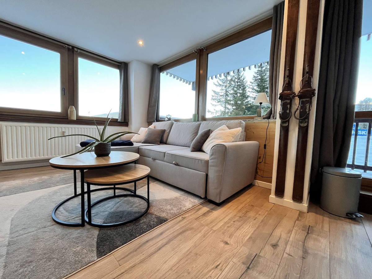 Slakaðu á í þessu rólega og stílhreina rými. Þetta heillandi 25m2 stúdíó er fjallavinin þín. Njóttu yfirgripsmikils útsýnis yfir Mont Blanc, fullan búnað (50"sjónvarp, þráðlaust net með trefjum, þvottavél, þurrkara, kaffivél, ketil, brauðrist, raclette-vél o.s.frv.). Lök, handklæði og hreingerningaþjónusta eru í boði. Skíðabrekkur eru við fæturna á þér. Matvöruverslun, veitingastaðir, skíðaleiga og passar eru nálægt stúdíóinu í byggingunni.