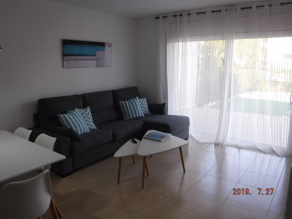 Mjög notaleg íbúð við ströndina. Beinn aðgangur að ströndinni án þess að þurfa að fara í gegnum veginn. Tilvalið fyrir fjölskyldur með börn. Einka og lokað þéttbýlismyndun. Nálægt verslunum, veitingastöðum, tómstundasvæði, reiðhjólaleigu o.s.frv. Leigan verður frá laugardegi til laugardags. EINKABÍLASTÆÐI í 150 m fjarlægð FRÁ ÍBÚÐINNI