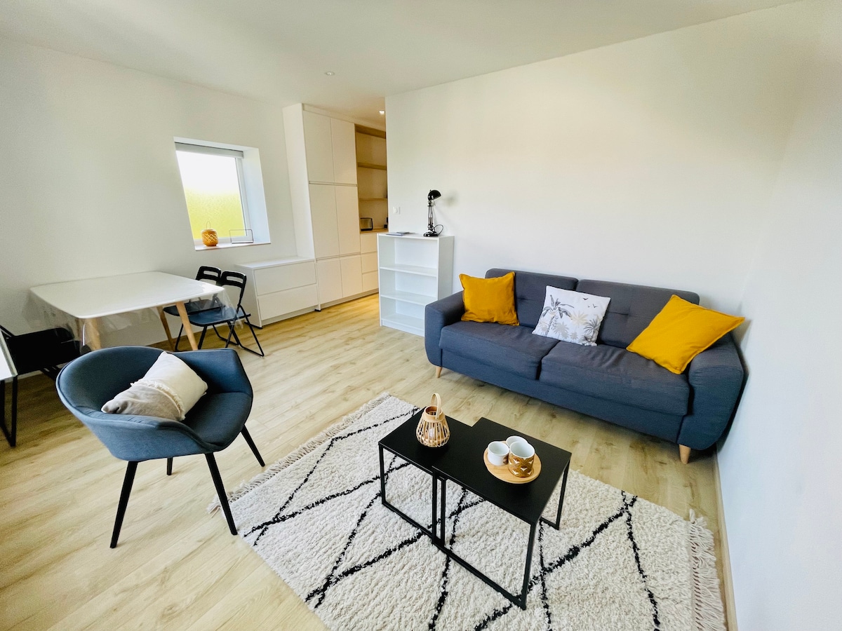 Fáðu þér glas af Pineau Charentais og njóttu þæginda þessa notalega, bjarta og notalega stúdíó. Það er skreytt vandlega af innanhússhönnuði í nútímalegu andrúmslofti og er með góðri aðstöðu fyrir 2 gesti. Öruggt bílastæði til ráðstöfunar er ókeypis. Lítið þægilegt stúdíó staðsett 100 m frá lestarstöðinni, nálægt gömlu höfninni og miðborginni. Einn eða sem par, tilvalið til að uppgötva La Rochelle fótgangandi eða á hjóli.