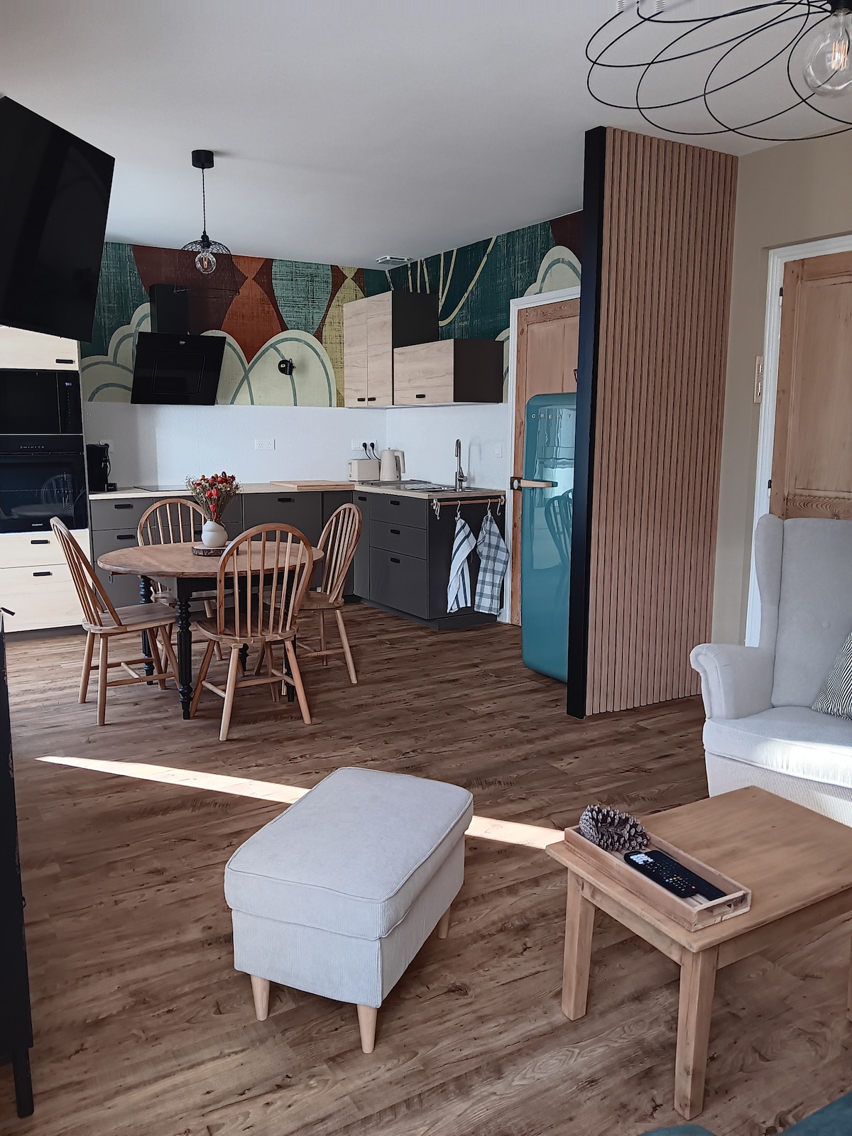 Íbúð á 1. hæð í lítilli íbúð nálægt miðborginni fyrir allt að fjóra. Tilvalin fyrir helgi eða frí á öllum árstíðum; íbúðin er nálægt Thermal og notalegri afþreyingu eins og keilu, veitingastöðum og skautasvelli. Point ++: Útsýnið af 1. hæðinni var yndislegt. Viðbótarupplýsingar: Lök, sængurver og handklæði eru ekki til staðar. Þú getur komið með þín eigin eða leigt þau í gegnum einkaþjóninn Sancy.