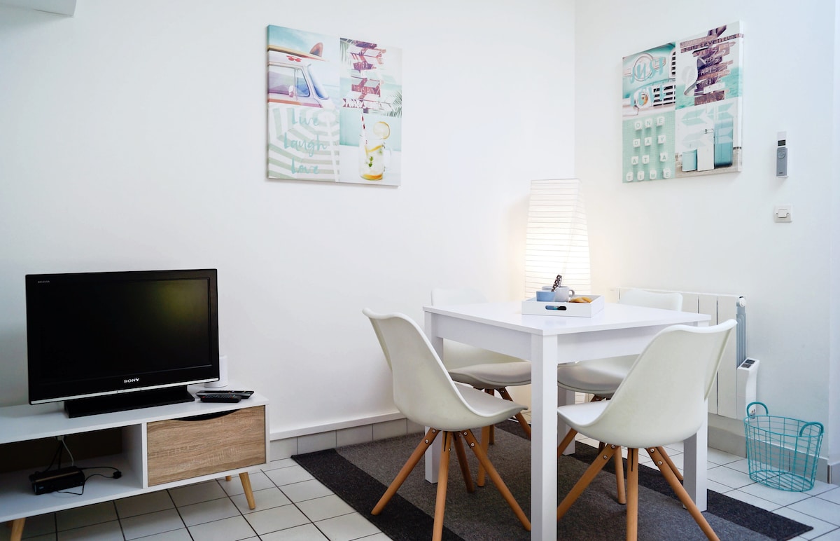 Appartement climatisé entièrement rénové à neuf en 2024 ✅ Place de parking privée gratuite Meublé avec goût classé 3 étoiles pour accueillir 2 personnes. Situé au 1er et dernier étage d'une petite résidence calme. le lit sera fait et les serviettes seront fournies À 17 minutes à pied du centre-ville et de la gare de La Rochelle. Première plage à 3,3 km grande douche climatisation silencieuse Fibre Tv Literie Bultex cuisine équipée Nespesso Etc Logement plein de charme à découvrir.