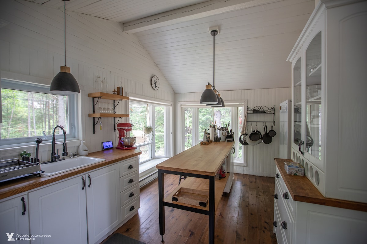 Welcome to La Khabine! This cozy, modern cabin comes with all you need to relax and connect with nature. Enjoy a glass of wine with the sound of a crackling fire in the wood burning fireplace. Take in the view of the forest through the surrounding floor to ceiling windows. Relax in the private outdoor cedar barrel sauna. Natural self-care products, firewood, laundry soap, and high-speed Wi-Fi are all complimentary. We hope you'll love our little cabin of windows as much as we do :)