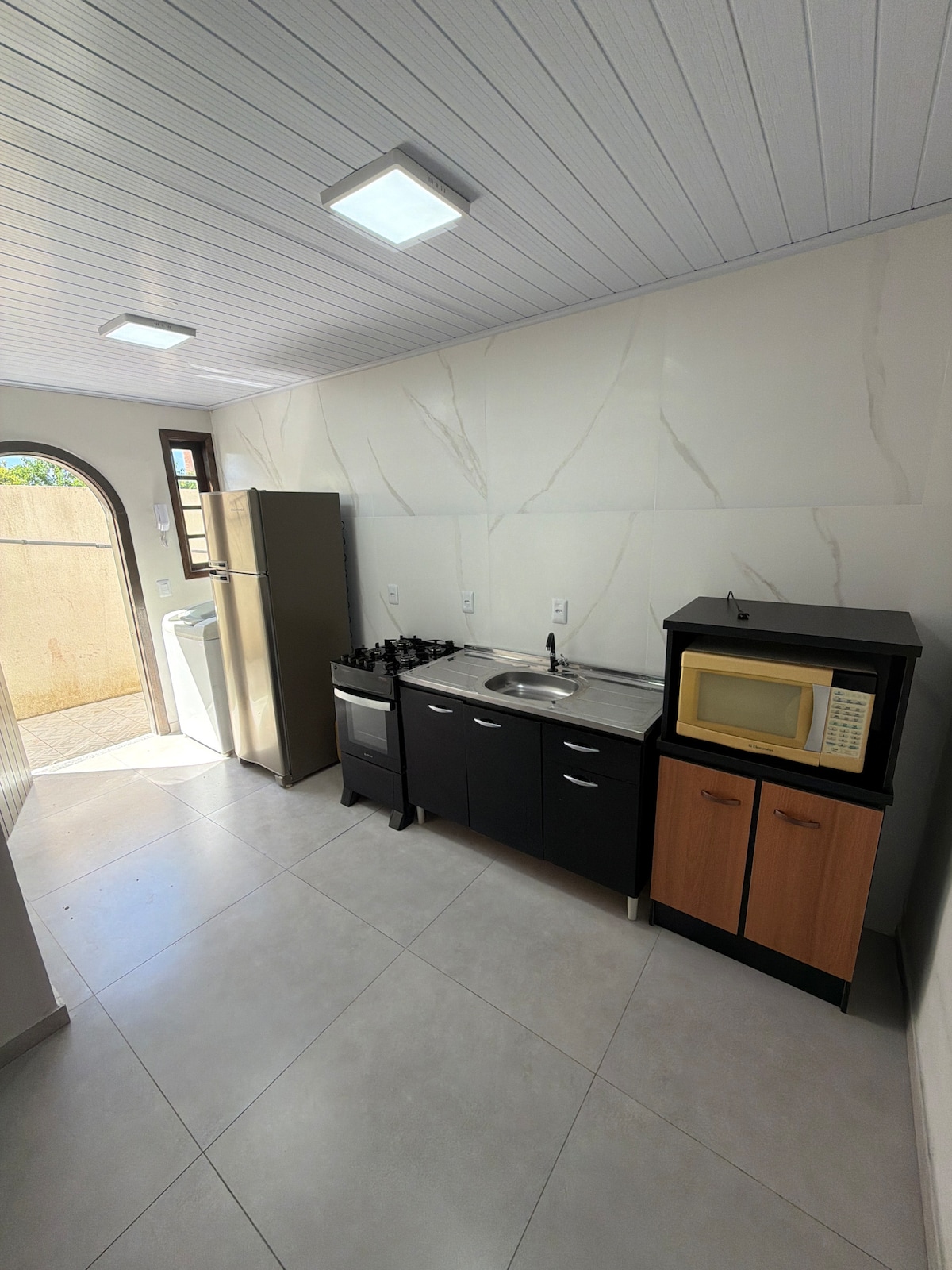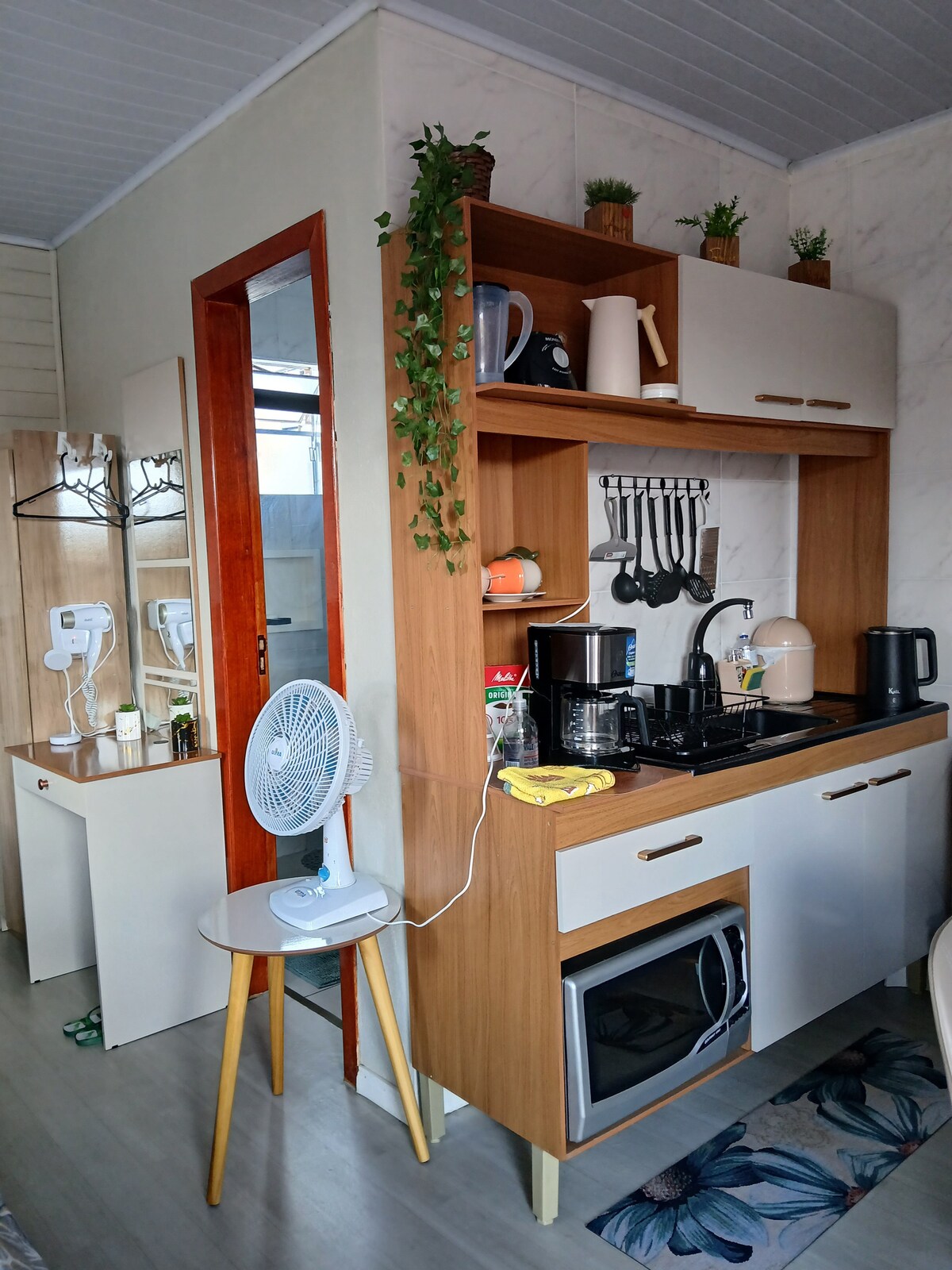 A microcasa é completa para o seu conforto. Comporta até umas 3 ou 4 pessoas, pois consta com 1 cama queen de casal , sofá cama e uma cama box de solteiro. Todos em um mesmo cômodo. Um diferencial para o nosso clima é o banheiro com box até o teto, água quente nas torneiras e na cozinha. Sabonete líquido, papel higiênico e uma cozinha completa para as refeições. Próxima a mercado e pizzaria. Tranquila, segura, há uns 5 min. do centro.