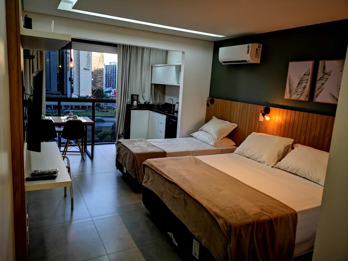 FLAT INTEIRO. - Flat no Hotel Vison Hplus, com decoração moderna, muito bem localizado ao lado da Esplanada. - Completamente mobiliado, com enxoval e amenities. - Wifi. - Self check in. - Recepção 24hs, Academia, Piscina e Sauna. - Restaurante e room service (pago a parte). - Limpeza e troca de enxoval durante a estadia (pago a parte). - NÃO TEM café da manhã. - Não é aprova de bebê.