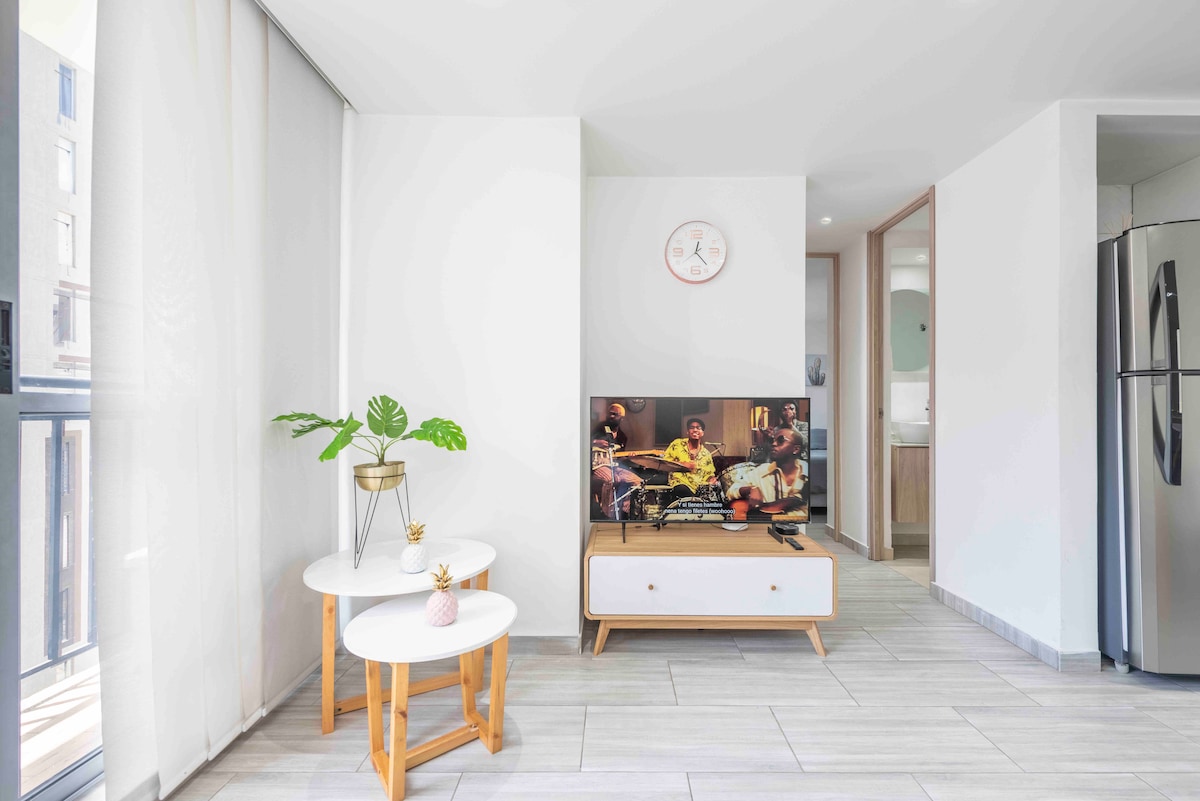 Þessi nútímalega íbúð býður upp á þægindi og kyrrð. Með einu svefnherbergi og einu baðherbergi er það fullbúið til að tryggja ánægjulega dvöl. Í aðeins 5 mínútna fjarlægð frá TransMilenio-stöðinni og 10 mínútna fjarlægð frá verslunarmiðstöðinni er hún fullkomin fyrir ferðamenn, fjölskyldur eða pör. Njóttu háhraða þráðlauss nets, eldhúss og byggingar þar sem öryggisgæsla er opin allan sólarhringinn. Notaleg og stílhrein hönnunin gerir staðinn tilvalinn til að slaka á eða vinna. Komdu og njóttu einstakrar upplifunar í borginni!