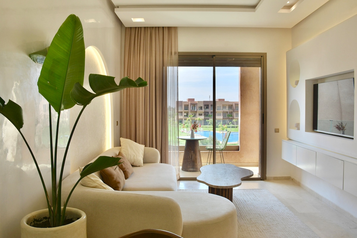 Escape to this modern, fully furnished 2-bedroom apartment in a quiet residence in Marrakesh. Perfect for families, it offers a peaceful retreat with a swimming pool and a mini soccer field. The bustling city center is just a short drive away, making a car a convenient option for exploring. Enjoy the spacious living area, a fully equipped kitchen, and a relaxing balcony. Whether by the pool or discovering the city, this apartment ensures a comfortable and memorable stay! No couples allowed
