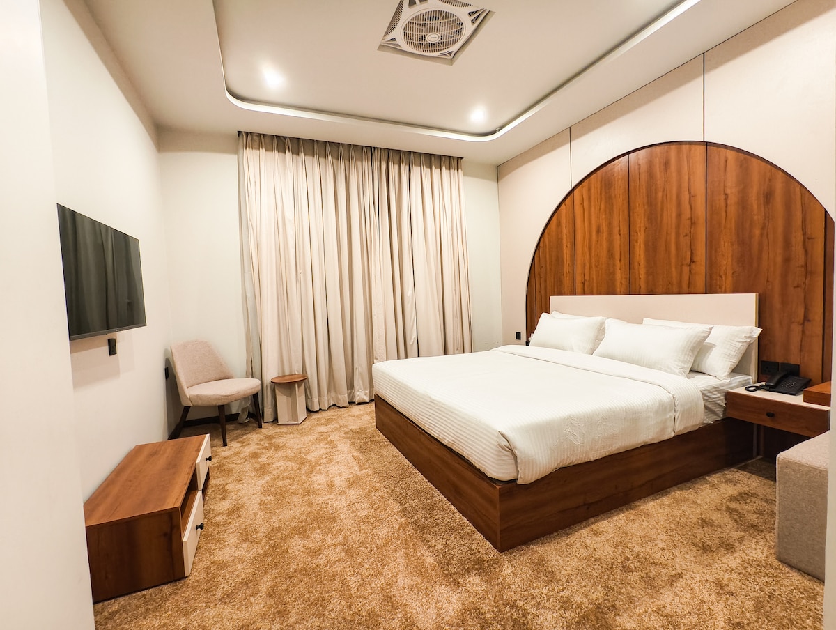 GoldTree Club by Goldtree Resorts - Deluxe Room offers a refined hotel stay in a centrally located property in Johar Town, Lahore, ideal for business & leisure guests. The room includes a king size bed, attached bathroom, sitting area, dressing space & cupboard, along with Smart TV, free Wi-Fi, mini fridge, complimentary water bottle, fruit platter, daily newspaper, shoe shiner, and ironing service for added comfort. Buffet Breakfast for two adults included. Kids below 7 years eats for free.