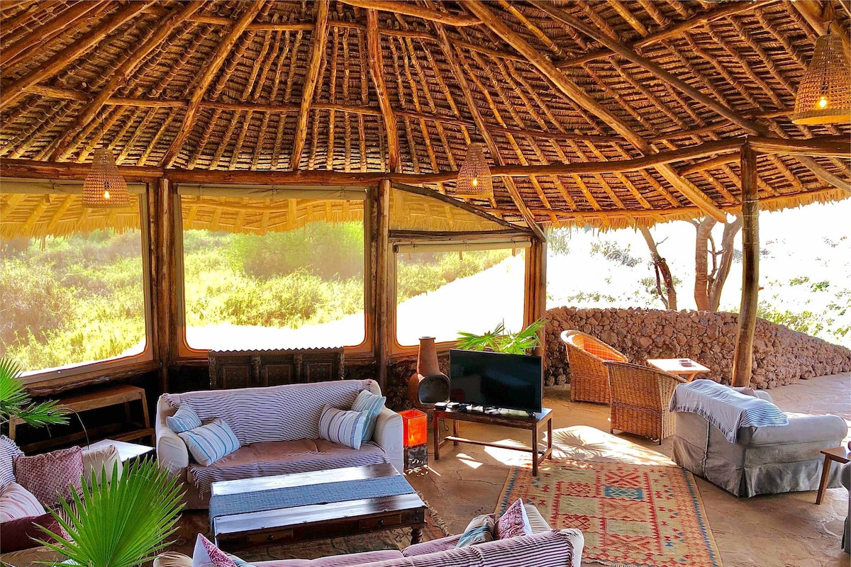 Upplifðu einstakt frí í heillandi orlofshúsinu okkar með einu svefnherbergi sem er hannað úr náttúrusteini til samræmis við umhverfið. Þægindi eru staðsett nálægt kyrrlátri sundlaug og veitingastað og njóta kyrrðarinnar hér. Þetta afdrep er staðsett við rætur Kilimanjaro-fjalls í 20 km fjarlægð frá Amboseli-garðinum og í 10 km fjarlægð frá gönguleiðum Loitoktok-skógarins og býður upp á magnað útsýni. Með framúrskarandi þjónustu frá starfsfólki okkar lofar dvöl þín þægindum, ævintýrum og ógleymanlegum minningum.