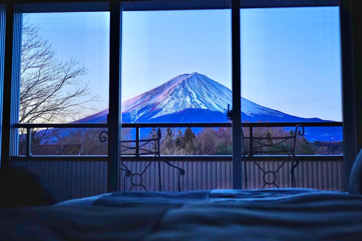 Fjallið Fuji í snjó! Hvaða gistingu viltu sjá? Frá rúminu? ... úr baðkerinu? COCON Fuji W-bygging