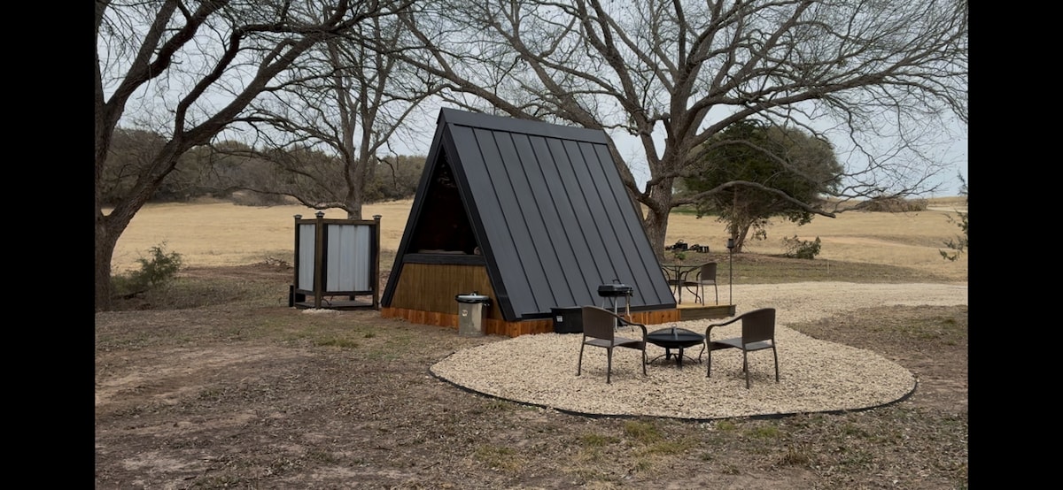 This quaint and beautiful A frame is nestled on a creek under towering oak trees. It is secluded and overlooks a large hillside where deer often roam. An outdoor charcoal grill & table reside close to the firepit along with a table and chairs. The natural beauty & peacefulness of this space is quite stunning. A large and inviting outdoor shower awaits you with a tankless water heater for an amazing experience. The sofa trundle transitions to a queen bed to sleep two adults.