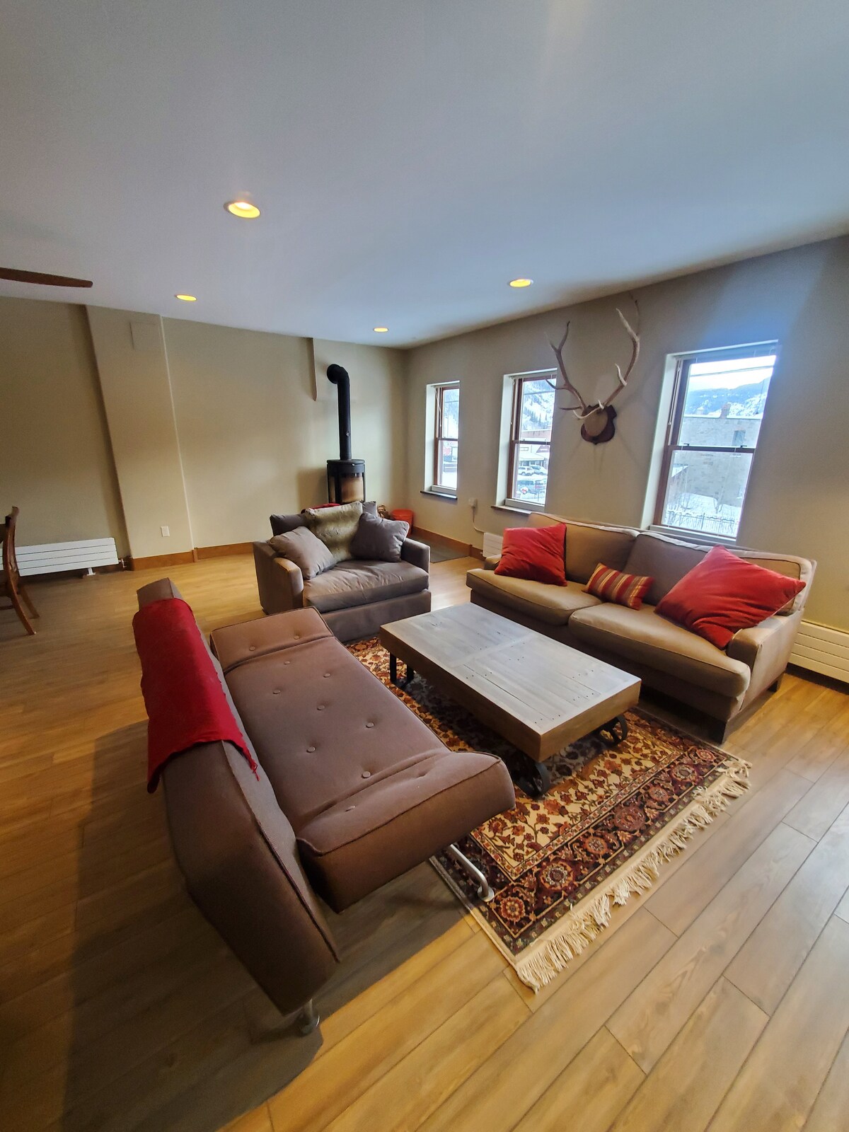 Þetta fallega afdrep í göngufæri frá hjarta Ouray er staðsett á móti hinum mikilfenglegu San Juan-fjöllum og býður upp á afdrep þar sem þægilegt er að vera í einveru. Á efstu hæð tveggja hæða raðhússins er stofa með gasarni, sjónvarpi, þráðlausu neti, borðstofu, eldhúsi, salerni og þvottaherbergi. Á efri hæðinni eru þrjú svefnherbergi og eitt fullbúið bað. Þetta er fyrir suðurhlutann, ekki eininguna fyrir ofan bílskúrinn sem hefur íbúa til langs tíma.