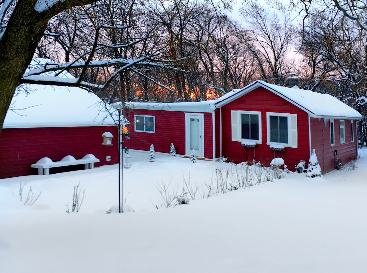 The Pond House, vintage glerskáli fullur af list, útsýni yfir vatnið og yfirgripsmikið andrúmsloft í einkaeigu á helgum forsendum Hackmatack Retreat Center. Native prairie, vinda hægur á, tvær tjarnir, 200+ ára gamlar eikur og stór himinn- Óteljandi staðir til að krulla upp, safna saman, fókus - krókar og kima innandyra og út, við bjóðum upp á „tíma út fyrir tíma í“ mitt í þessum háværum heimi. Mínútur frá 2 litlum bæjum, öll þægindi, við erum öll um frið og vellíðan - láttu okkur sérsníða upplifun þína!