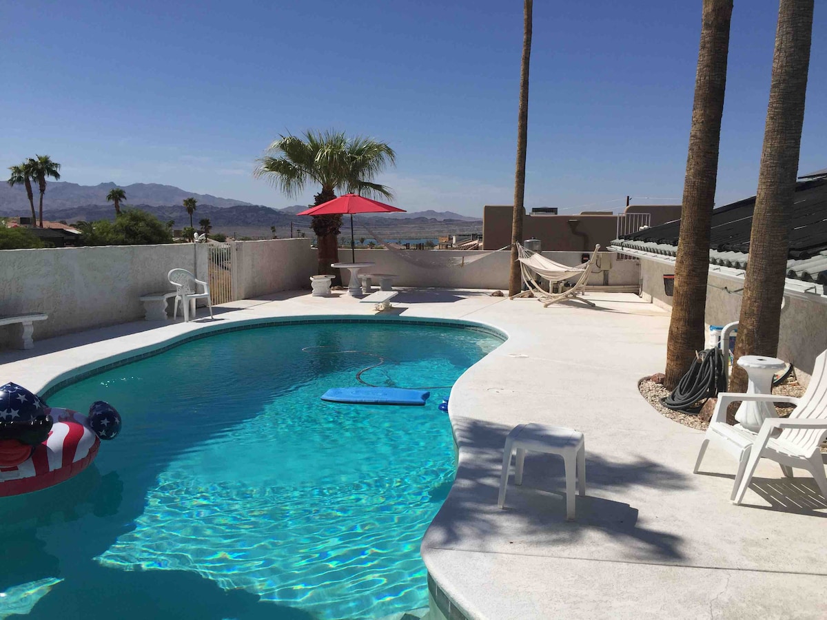 Centrally located and 2 min to jet ski beach. If your here for the water, the sun the desert or a little bit of it all. Our home and its pool is your place to enjoy it all. Our cozy home has recently been remodeled and upgraded inside and out. She sleeps 10 with room for a few more. New appliances, ample parking for 8 vehicles or trucks & toys. Short walking distance to Cypress Park for the kids and animals. Great view of the Lake as well. BBQ and relax by the pool and enjoy the evening.