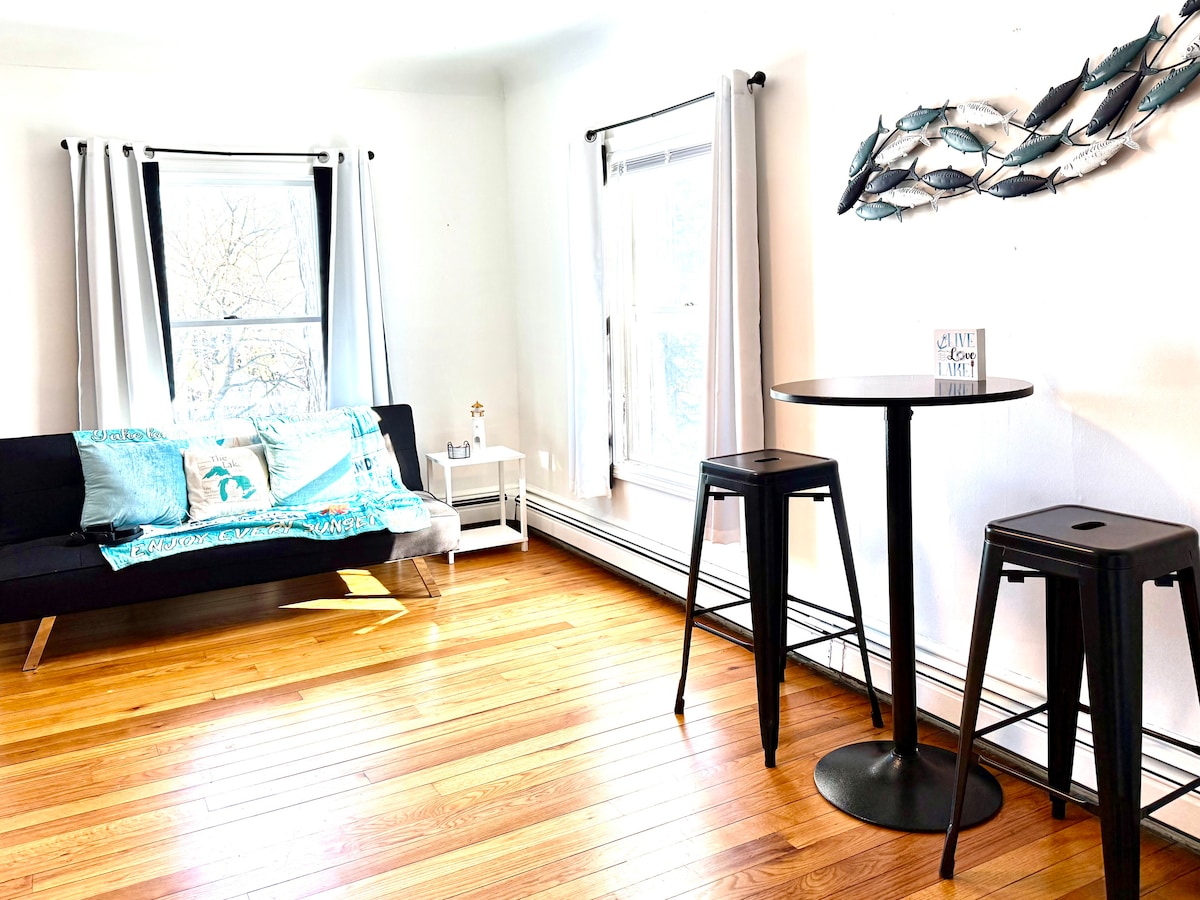Njóttu útsýnisins og notaðu Mullett Lake í rólegu íbúðinni á efri hæðinni. Þú ert í göngufæri til að nota 100' af sandströnd og bryggju. Á þessu svæði er hægt að gera endalausa afþreyingu eins og að ganga eða hjóla á stígnum fyrir utan, synda, sigla, heimsækja Mackinaw-eyju, fara á snjósleða, hjóla hlið við hlið frá dyrunum, heimsækja veitingastaði og margt fleira. Góður aðgangur að mörgum öðrum vötnum og bæjum. Þetta er yndislegur staður til að slaka á í sólinni eða snjónum sem par eða fjögurra manna fjölskylda.