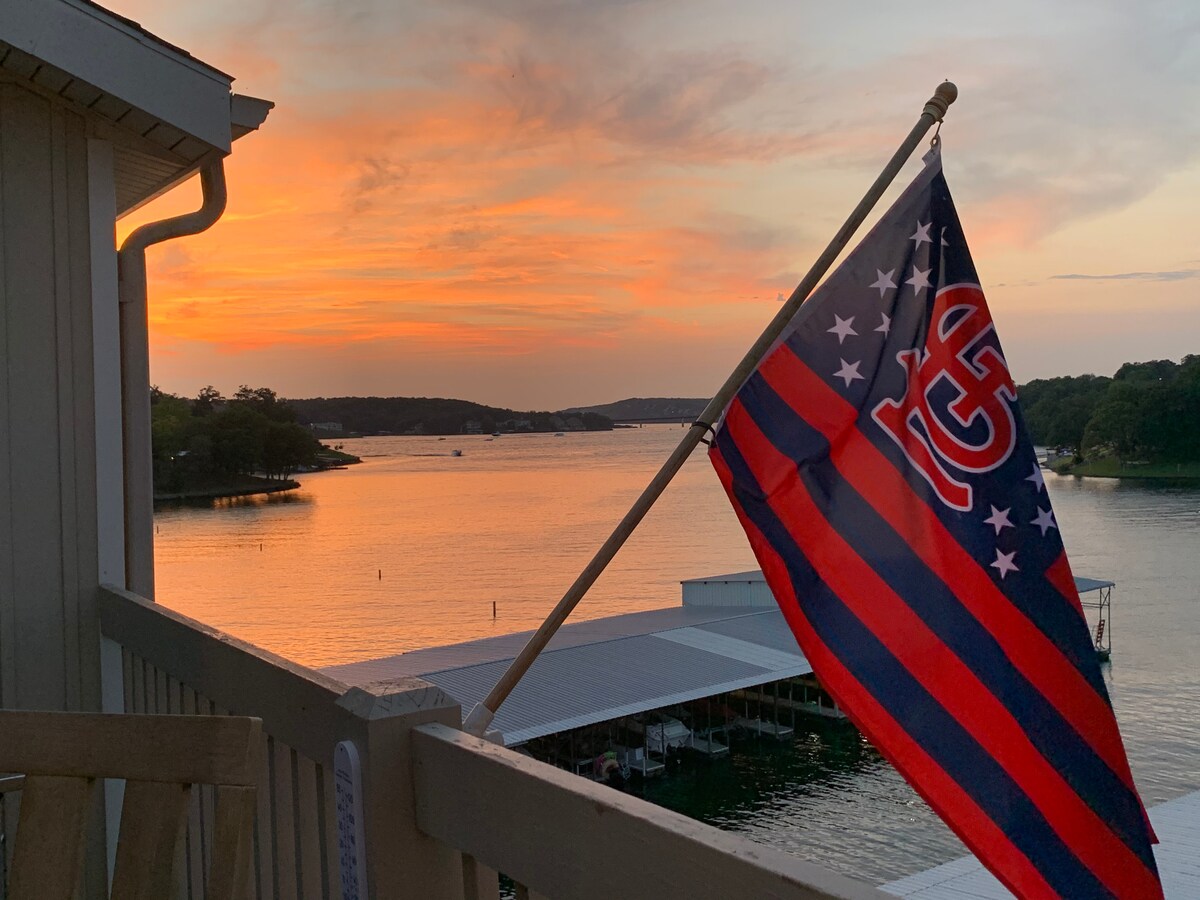 Fábrotinn sjarmi + nútímaþægindi. Kofinn okkar frá 1930 er ofan á einum eftirsóttasta útsýnisganginum við vatnið. Meira en 100 metra yfir vatninu með útsýni yfir flugeldasýningar á staðnum, gullfalleg sólsetur og magnað útsýni þegar afþreying er í boði við vatnið. Hreiðrað um sig í óbyggðum, kyrrlátir dagar og nætur eru margir. Staðsett í hjarta Osage Beach með aðgengi að stöðuvatni í þjóðgarðinum, steikhús við hliðina á eigninni og vínbar.
