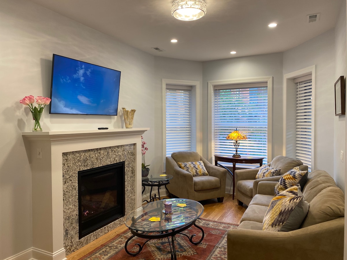Komdu og njóttu þessarar hlýlegu og rúmgóðu 2br/1ba vintage íbúðar í hjarta Lakeview! 10 mínútna göngufjarlægð frá Wrigley Field og steinsnar frá mörgum veitingastöðum og verslunum. Fullbúið eldhús, borðstofa (tekur sex manns í sæti), arinn til skreytingar, sjónvarp með eldpinna, tvö svefnherbergi með queen-rúmum, skrifstofurými fyrir fjarstýringu og stór einkaverönd með gasgrilli. Mjög nálægt Lake Shore Drive, stutt að ganga að Belmont L og auðvelt aðgengi að mörgum rútum. Lágmarksdvöl eru tvær nætur.