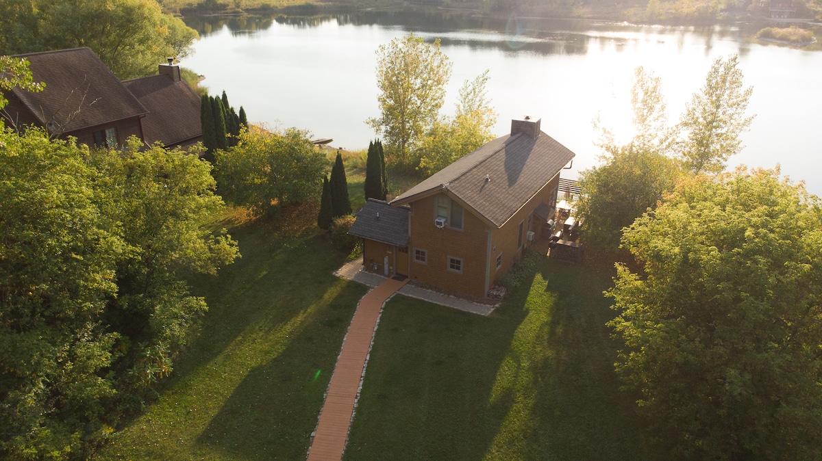 Bústaður við stöðuvatn með útsýni yfir Sandy Shore og sólsetur