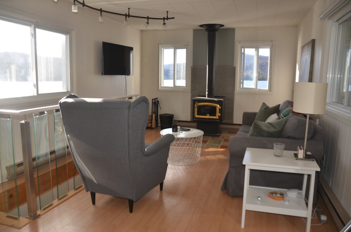 Þessi einstaka eign er við hliðina á vatninu, vatn á 23 hliðum yfirbyggða pallsins. Notalegt, rómantískt frábært útsýni og ótrúlegt sólsetur sem snýr í suður svo að sólin skín allan daginn. Svefnherbergi með 8'veröndardyrum sem horfa út á vatnið og einkaveröndina þína. Heitur pottur í 15 skrefa fjarlægð. Aðalhæð er með fullbúið eldhús, tvær borðstofur, eitt með útsýni yfir vatnið. Hundar (hljóðlátir og ekki árásargjarnir) velkomnir. CITQ #298403