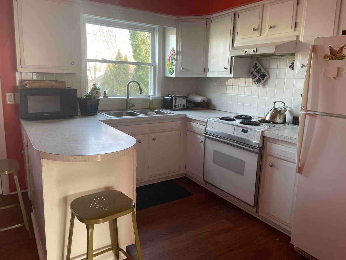 Slakaðu á og slakaðu á í þessu rólega og stílhreina rými. Þessi íbúð á annarri hæð er með nýuppgerða baðherbergi, fullbúið eldhús, þægilegt svefnherbergi sem er fullkomið fyrir tvo og notalega setustofu með stólum sem breytast í tvö einbreið rúm. Hún býður einnig upp á bílastæði við götuna fyrir eitt ökutæki og sérinngang á pallinum. Þetta er fullkominn staður til að slaka á og njóta sumarsins og haustsins. Við bjóðum þér að njóta heimilisins með köttinum okkar Taffy sem mun taka á móti þér (en mun ekki trufla þig).