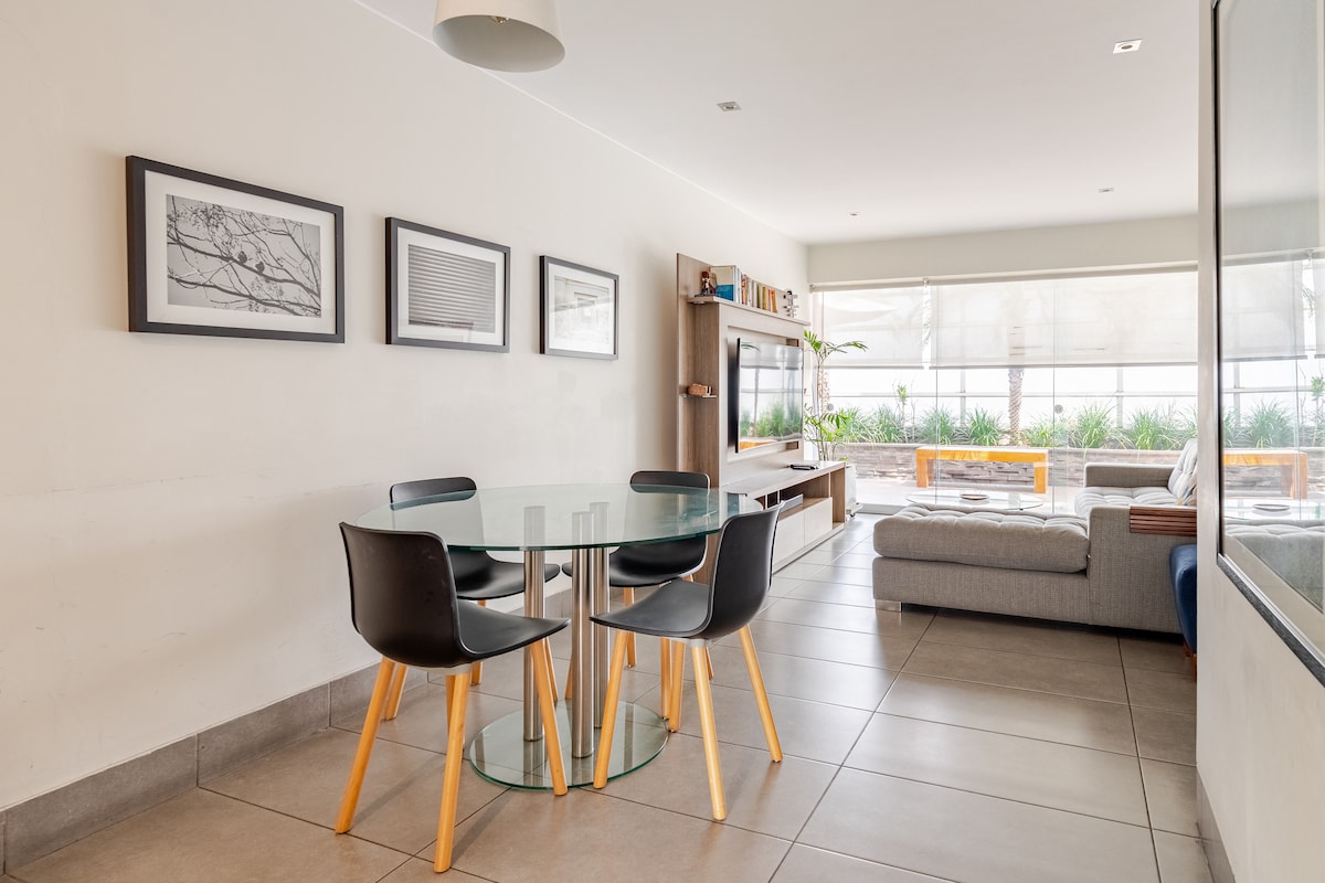 Verið velkomin í athvarf drauma þinna í Miraflores, töfrandi horni Lima sem bíður þín með opnum örmum og útsýni sem gleður sálina. Staðsetningin er fullkomin, það er einni húsaröð frá Av. Larco; mjög nálægt Kennedy Park, ströndinni, Larcomar, veitingastöðum, börum, matvöruverslunum, verslunum, kvikmyndahúsum og menningarstöðum fótgangandi. Í byggingunni er öryggisgæsla allan sólarhringinn og kaffihús með verönd. Bílastæði og kapalsjónvarp fylgir.