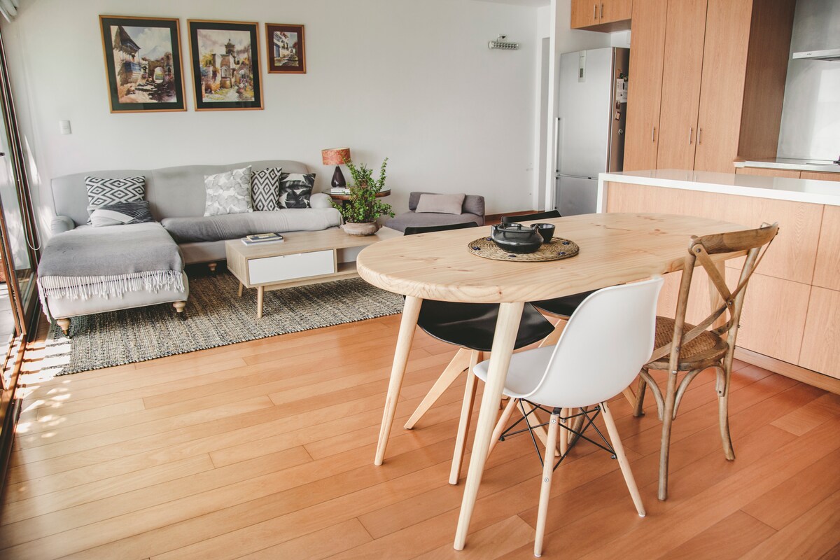 Velkomin/nn í CasaSaya, heimilið þitt í Miraflores — glæsilegt, friðsælt og fullkomlega staðsett. Þessi rúmgóða 60 m² íbúð býður upp á ró og stíl, með mjög þægilegu king-size rúmi, loftræstingu/hitara, einkaverönd, þvottavél og hröðu Wi-Fi — tilvalið fyrir viðskiptaferðamenn, pör eða lengri dvöl. Staðsett við rólega götu aðeins þrjár húsaraðir frá göngubryggjunni og fimm frá Larcomar. Þú munt vera umkringd(ur) kaffihúsum, veitingastöðum og sjávarútsýni — allt í göngufæri en samt í friði frá fjölförnum strætum.