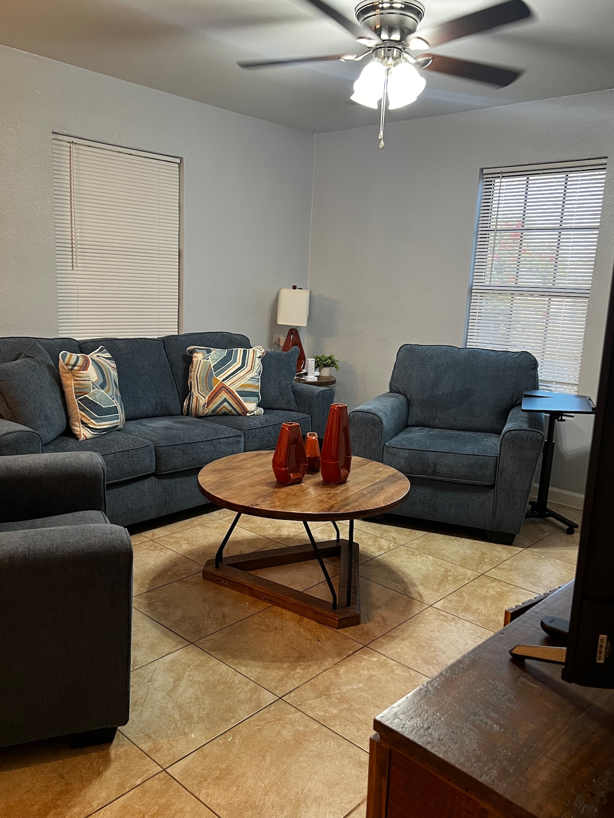 Þetta notalega og friðsæla heimili er með þremur svefnherbergjum og tveimur baðherbergjum. Aðalsvefnherbergið er með king-size rúmi, gestaherbergið er með queen-size rúmi og þriðja svefnherbergið er með tveimur einbreiðum rúmum. Öll herbergin eru með snjallsjónvörpum og 65 tommu sjónvarp er einnig í stofunni. Í aðalinnangengi skápnum er þvottavél/þurrkari. Eldhúsið er fullbúið nauðsynjum og er með eyju sem er fullkomin til að njóta morgunverðar. Hún er með yfirbyggðum bílastæðum, stórum bakgarði fyrir aukaleg bílastæði og útimyndavélum.