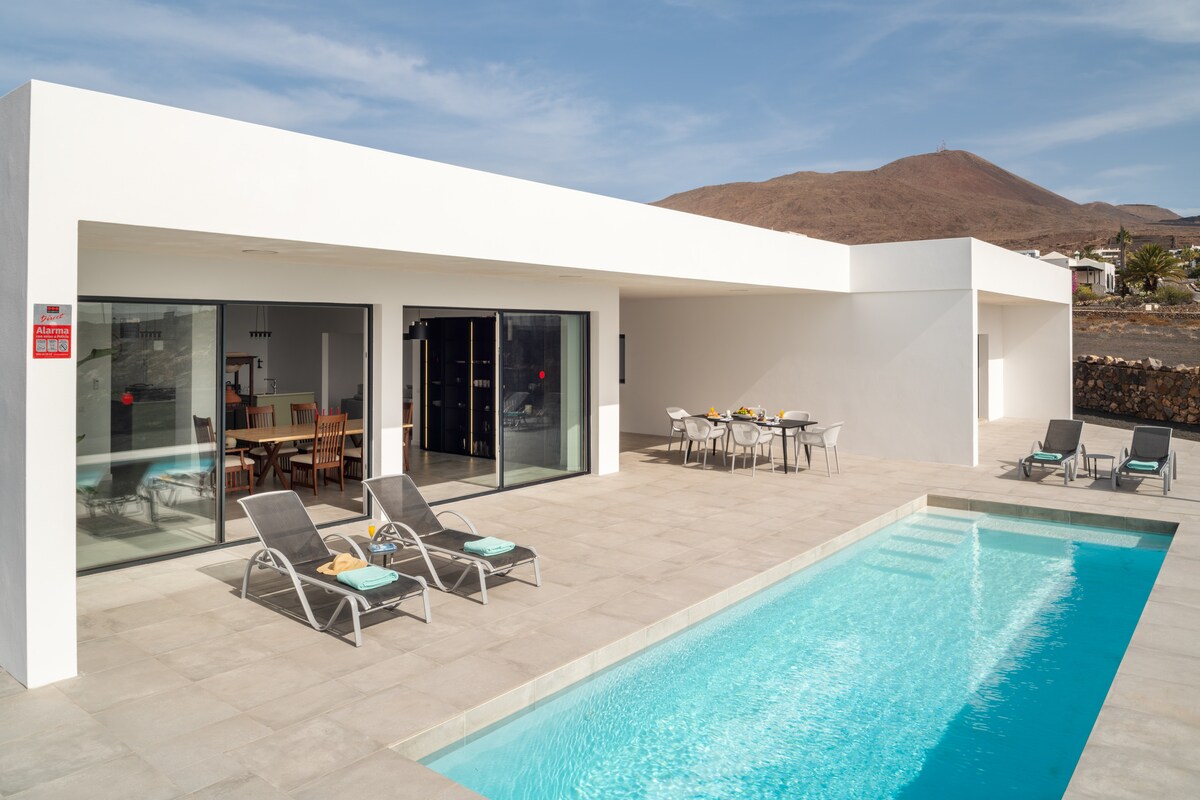 Minimalískt hús með útsýni yfir eldfjall og upphitaðri sundlaug