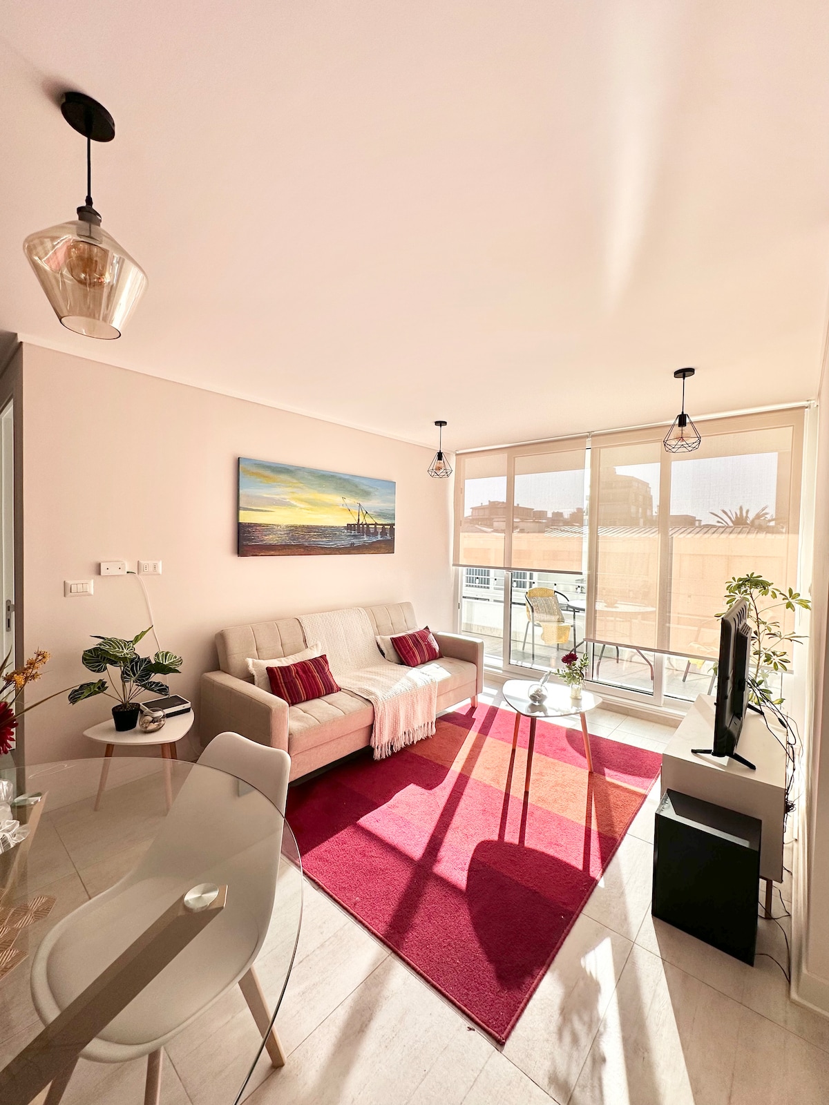 Staðsett fyrir framan ströndina og við hliðina á verslunarmiðstöðinni. Þú ert með allt við höndina í fínni byggingu með 2 sundlaugum. Þvottahús er til staðar. Ef þú vilt ekki fara munt þú hafa frábæra verönd til að sjá bestu sólsetrin á fimmta svæðinu. Mælt er með því að koma á bíl ef þér líkar ekki að ganga. Innisundlaugin þarf að nota sundhettu úr plasti (um allt Síle). Þetta lok er til einkanota og óbætanlegt svo að þú ættir að koma með þitt eigið.