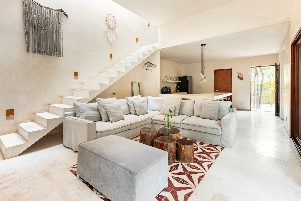 DURING THIS DAYS WE ARE TAKING EXTRA CONTROL AND PRECAUTIONS ON THE CLEANING: WE USE SPECIAL PRODUCTS TO SANITIZER ALL THE AREAS OF THE VILLA. OUR STAFF USE GLOVES AND MASK ALL THE TIME. This peaceful home is part of Holistika, a yoga and wellness center. Minimalist decor with natural wood and cool stone accents add to the sense of calm. Doze in the garden hammock beneath twinkling fairy lights and float in the villa's private pool. Located in the new residential development called “Holistika" (wellness center and yoga center). Just side to the center of Tulum, in a unique park. This new neighborhood offers nature and wellness. The Villa is composed of three bedrooms, two of them have a king size bed with a full bathroom (one with bathtub) and the other has two queen beds with a shower room separated. We have a TV room with a sofa that can be used as a bed. Fully-equipped (TV, Wi-Fi, kitchen, oven, freezer, coffee machine, fans, air-conditioning in each room, washer/dryer) with a beautiful “palapa”, garden an a private swimming pool. The resort offers many holistic treatments and fun activities onsite. Restaurants, craft boutiques, and a bakery are within walking distance. Stunning local beaches, remarkable archeological sites, and downtown Tulum are a short drive or cycle away. It's really easy and safety to use transports in Tulum. Walking, biking, taxi service or car rental service. A new bicycle pathway allows you to bike to the beach easily!