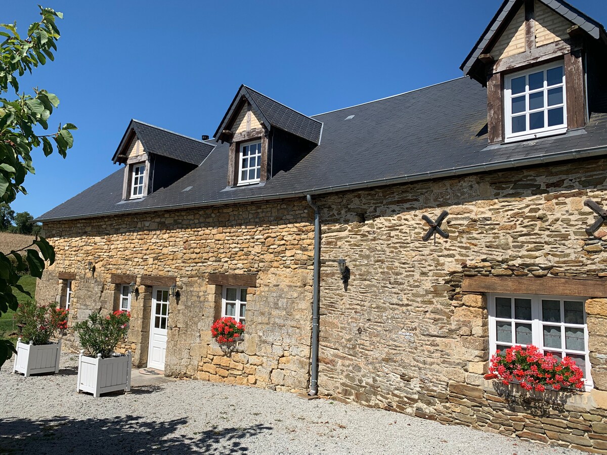 Notre logement (13 personnes max) est proche de Caen (25 mn) et de la mer dans une très belle campagne du pré-bocage en Normandie. Facile d'accès par voiture, train et aéroport. Vous apprécierez notre logement pour sa beauté, la campagne, le repos, ses chevaux (équitation possible), les massages et la piscine couverte et chauffée. Idéal pour familles de 4 à 10 personnes. La 4eme chambre est un très grand couloir, Je mets donc très souvent une chambre en plus de l'annexe pour plus de confort.