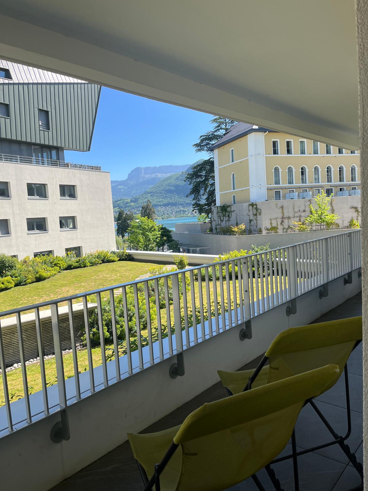 2 herbergja íbúð með tresums, útsýni yfir stöðuvatn og fjöll, 2 skrefum frá vatninu og gamla bænum Annecy, nýtt húsnæði, nálæg strönd, bílskúr innifalinn (Hæð 2,05m, Lengd 5.60 m, breidd 2,40m) auk öruggs hjólaherbergis (sem beðið er um við bókun) Flokkað Meublé de Tourisme 3 stjörnur