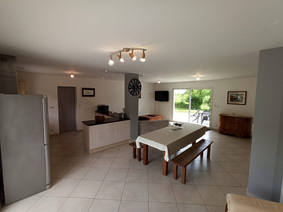 Komdu og slappaðu af í sveitinni í þessari uppgerðu 90m2 gömlu hlöðu sem rúmar 6-7 manns: - 3 svefnherbergi, þar á meðal 2 uppi (2 rúm 160x200 - 2 rúm 90x190 - aukarúm - viðarrúm) - 1 baðherbergi: útbúin sturta fyrir fólk með takmarkaða hreyfigetu, hárþurrka, þvottavél - 2 útbúin salerni fyrir hreyfihamlaða, þar á meðal 1 uppi - 40m² stofurými: vel búið eldhús, borðstofa, setustofa, foosball - lokaður húsagarður: garðhúsgögn, 4 sólbekkir, grill