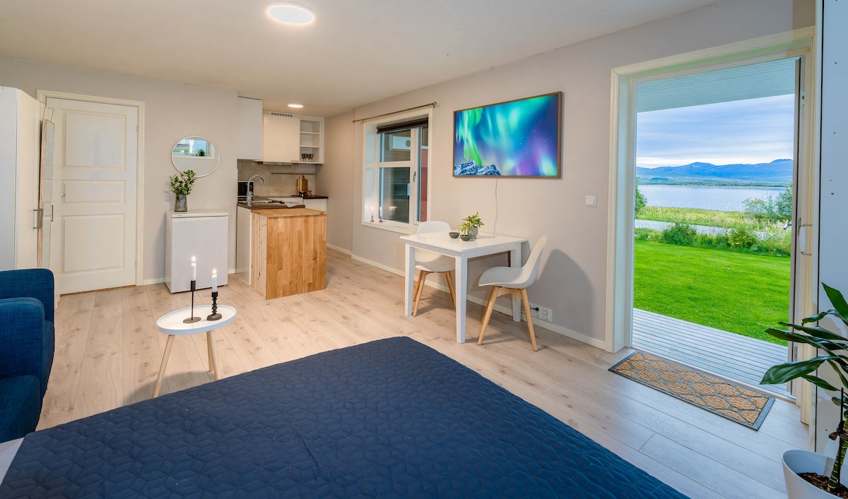 Looking for a magical, romantic escape? This modern and cozy studio offers an unforgettable view of the Aurora, away from city lights. Just step outside to your private floating quay for a pristine, unobstructed Aurora experience. Everything you need for a perfect night outdoors is included. Rent a private sauna with access to the quay for a refreshing dip in the polar waters—perfect for photo moments! Just 12 minutes from the airport, your space is private and faces a quiet parking area.